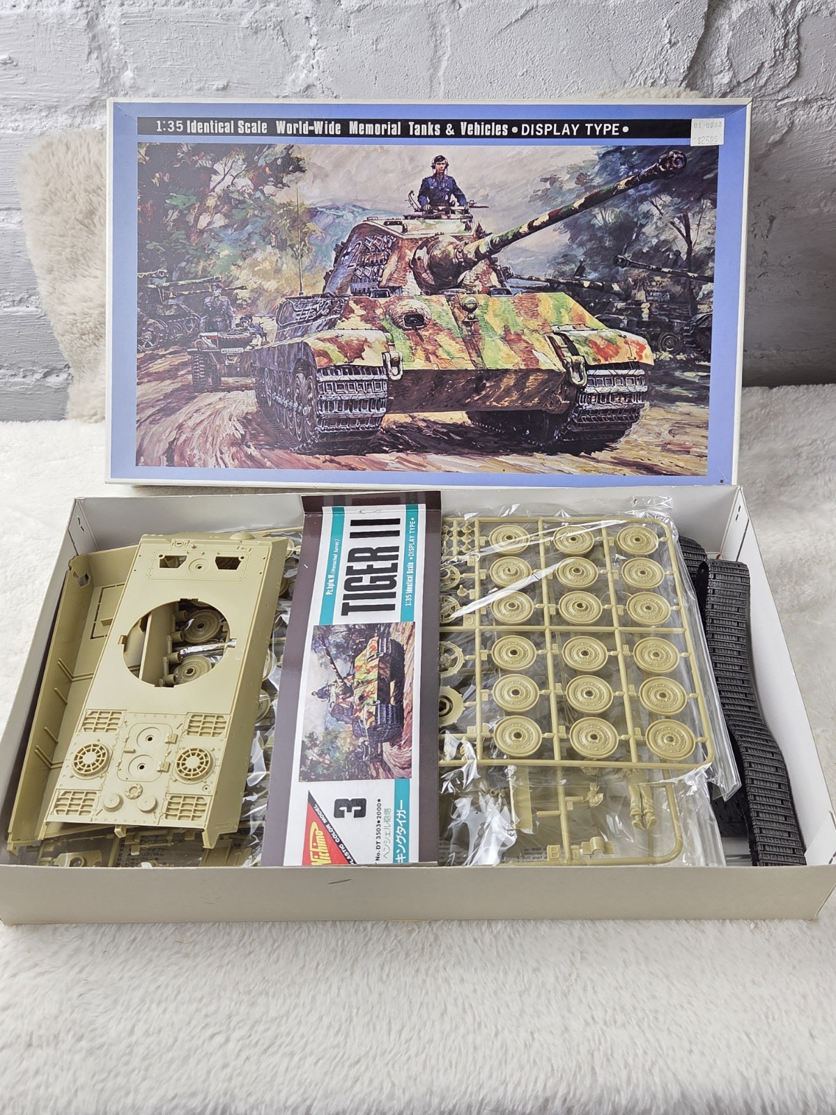 Rare Nichimo 1:35 Tiger II WWII Tank Kit Sealed Parts New Own rarity with this Rare Nichimo WW II German Tank Tiger II 1:35 — Sealed Parts New ! Pristine 1970s kit. SEO for "rare nichimo 1/35 tiger ii sealed." Japanese engineering—perfect for Porsche turret fans. Issue Highlights & Kit Breakdown Main Feature: Porsche Turret – Curved front, early cupola. Historical Profile: s.Pz.Abt. 503 – Feldherrnhalle markings. Decals: Zimmerit Patterns – Pre-molded paste options. Build Tip: Track Tension – Vinyl tracks with sag. Pair With: Jagdtiger – Heavy tank family. Nichimo's finest—add metal barrel for elite. True collector's grade! Condition Details Sealed Parts New: Box and bags factory fresh. Why Collectors Love It Porsche Turret: Early King Tiger variant. Nichimo Legend: Japanese 1:35 pioneer. Shipping & Returns 2 Day Shipping Available Upon Request, 30-day returns.