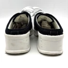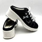 Vintage 90s Y2K No Boundaries Platform Sneakers Model: MICHELE Black Canvas Upper Lace Up Slip On Open Back Round Toe Block Heel Metallic Silver Embroidered Beaded Dragonflies on Sides Shoe Width: Standard 2.5" heel 1" platform Women's Size US 8.5 UK 6.5 EU 39 Great vintage pre owned condition. Gently owned. Mild wear on soles - shown in photos. Otherwise, no rips, tears, stains, holes or other notable flaws. Clean and from a smoke free home.