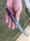 CUSTOM HAND MADE HAND FORGED DAMASCUS STEEL BOOT KNIFE DAGGER HUNTING KNIFE This superb design knife is hand forged. Blade of this knife has a nice file work and is made of 512 layers of 4340 stainless steel and 1075 high carbon steel and hardness 55-58 HRC . This robust knife is lab tested under intense conditions, the balance and shape of this knife ensures perfect grip. Overall Length: 8.5" Inches Blade Length: 4" Inches Handle Length: 4.5" Inches Damascus Design: Twist Pattern Layers: 512 Sheath: Leather Hand Forged