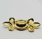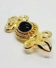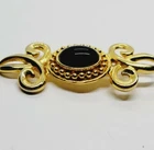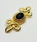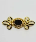 Item Length:1" x 2.5"Country/Region of Manufacture:UnknownMain Stone Color:BlackMetal Purity:UnknownMaterial:MetalJewelry Department:FashionType:BroochSigned:NoMain Stone:Faux Black OnyxVintage:YesMetal:UnknownBase Metal:UnknownMain Stone Shape:OvalBrand:Estate Jewelry UnsignedDepartment:WomenHandmade:NoColor:Gold