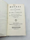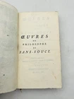Charmant exemplaire en reliure de l'époque en plein veau marbré, dos lisse orné de caissons dorés, pièces de titre en maroquin, comportant quelques frottements d’usage et petits accrocs en coiffes. Édition de 1760 des célèbres Œuvres du Philosophe de Sans-Souci , pseudonyme du roi Frédéric II de Prusse, figure emblématique du despotisme éclairé. L’ouvrage, publié à Neuchâtel, était destiné à une diffusion restreinte en raison de ses prises de position philosophiques audacieuses. Rédigés en français, ces textes mêlent poésie, réflexions politiques et critiques sociales, dans la lignée des Lumières. La présente édition se veut plus complète que les précédentes, enrichie de variantes, et reproduit fidèlement la copie in-4° de 1750 imprimée au château de Sans-Souci. Belle impression sur papier vergé, reliure homogène de qualité. C12