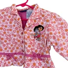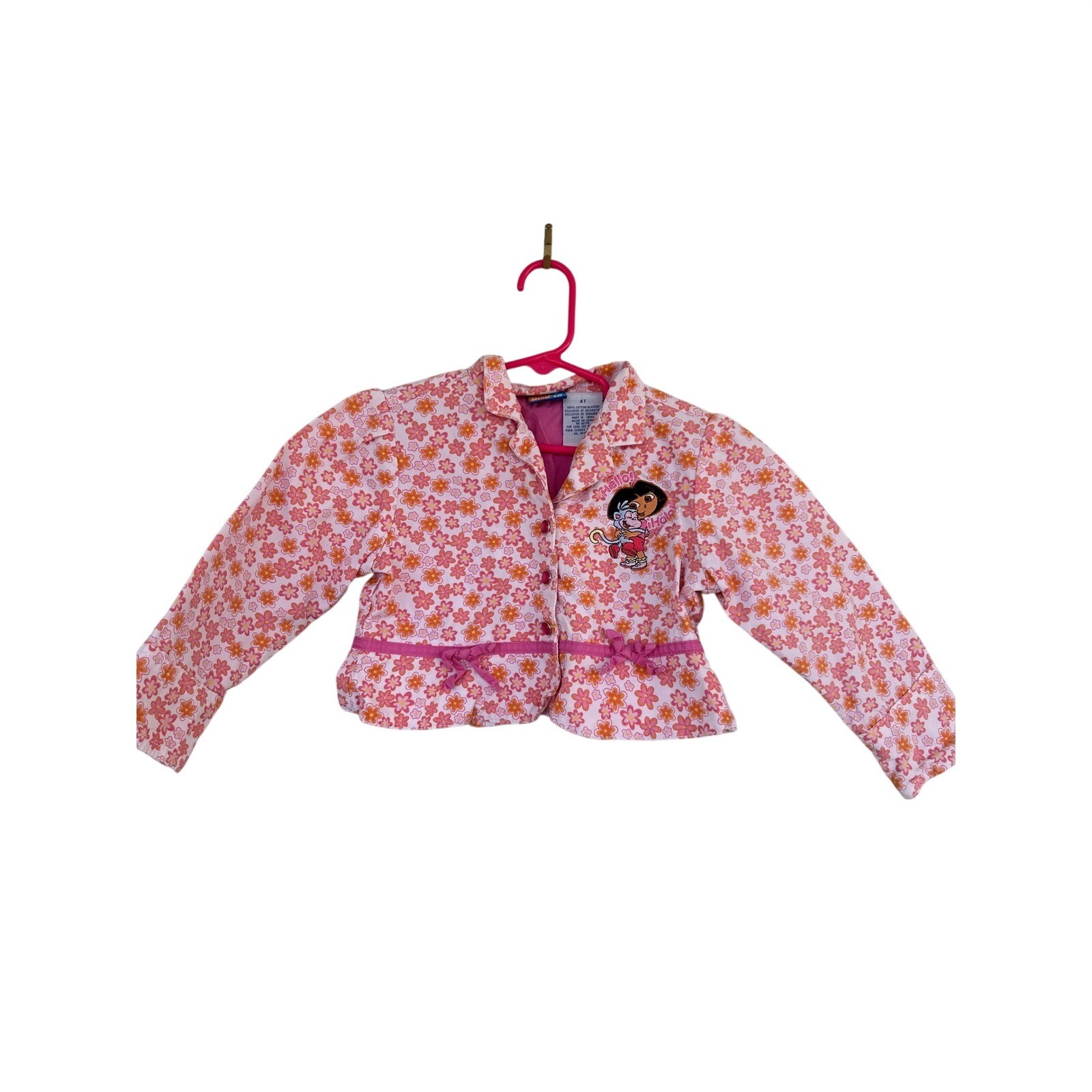 Dora the Explorer Nick Jr girls jacket in size 4T. This charming piece features a vibrant pink and orange floral print with adorable Dora and Boots applique on the chest. Accented with delicate pink ribbon and bow trim along the hem and front buttons, it offers a playful yet stylish look. Perfect for everyday adventures or dress-up play. Measurements: • Chest (armpit to armpit): 13 in • Length (shoulder to hem): 16 in • Sleeve Length (shoulder seam to cuff): 15 in Style: Basic Jacket Department: Girls Outer Shell Material: 100% Cotton Type: Jacket Season: Spring, Fall Lining Material: Polyester Fabric Type: Woven Features: Lined, Contrasting Trim Character: Dora the Explorer Theme: Garden Accents: Bow, Button, Embroidered Closure: Button Occasion: Casual Pattern: Floral Keywords: Dora the Explorer, Nick Jr, girls jacket, floral print, button up, blazer, kids fashion, character apparel, spring jacket, playtime outfit, themed clothing All items come from a smoke free, golden retriever dog friendly home. All of items unless NWT or Dry Clean Only are washed with Tide or according to care tag if hand wash only. We try our best to disclose any flaws with items, if we miss something please reach out and let us know. We can offer combined shipping on all our items. Please compare the items measurements to something you already own. We ship M-F within business days.