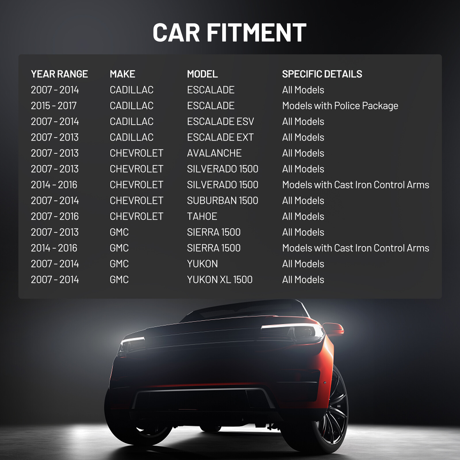 Kit Includes: 1 X Front Left Upper Control Arm w/ Ball Joint Assembly, 1 X Front Upper Passenger Side Control Arm w/ Ball Joint Assembly Compatible with: for Escalade 2007-2017; for Escalade ESV EXT 2007-2014; for Chevrolet Avalanche, Silverado 1500 2007-2013; for Chevy Silverado 1500 2014-2016; for Suburban 1500 2007-2014; for Tahoe 2007-2016; for GMC Sierra 1500 07-13; for Sierra 1500 14-16; for Yukon, Yukon XL 1500 07-14 Replace for Part Number: 15096197 15096198 Installation Notes: The suspension kit must be installed by professionals. All the control arms assembly come pre-greased. 2x Front Upper Control Arms Ball Joints for Chevy Silverado GMC Sierra1500 Tahoe Package Includes 1x Front Upper Left Control Arm w/ Ball Joint Assembly - K80669 1x Front Upper Right Control Arm w/ Ball Joint Assembly - K80670 Fitment YEAR RANGE MAKE MODEL SPECIFIC DETAILS 2007 - 2014 CADILLAC ESCALADE All Models 2015 - 2017 CADILLAC ESCALADE Models with Police Package 2007 - 2014 CADILLAC ESCALADE ESV All Models 2007 - 2013 CADILLAC ESCALADE EXT All Models 2007 - 2013 CHEVROLET AVALANCHE All Models 2007 - 2013 CHEVROLET SILVERADO 1500 All Models 2014 - 2016 CHEVROLET SILVERADO 1500 Models with Cast Iron Control Arms 2007 - 2014 CHEVROLET SUBURBAN 1500 All Models 2007 - 2016 CHEVROLET TAHOE All Models 2007 - 2013 GMC SIERRA 1500 All Models 2014 - 2016 GMC SIERRA 1500 Models with Cast Iron Control Arms 2007 - 2014 GMC YUKON All Models 2007 - 2014 GMC YUKON XL 1500 All Models OEM Part Number(s) K80669 K80670 Features 100% Accuracy of Fit, Easy to Replace, Heavy Duty, Sealed Replace Placement on Vehicle:Front, Left, Lower, Right, Upper Type: Control Arm & Ball Joint Assembly Fitment Type: Direct Replacement Properties & Material ❥Direct fit and made from high quality materials,brand new control arms part. ❥Built to last – anti-rust coated, high strength steel tubing and solid plate mounting brackets provide superior strength and durability ❥A control arm connects the wheel hub and steering knuckles to the chassis, making them essential to your vehicle's suspension. Contact us Please Check And Confirm This Item Fits Yours Before Buying.If you have any issues with our product, please contact us immediately and we will do our best to resolve your issue. Payment Delivery details Terms of sales About us Contact us Payment 1.We only accept PayPal. PayPal is the only online payment method we accept. Please make sure you have a valid/confirmed PayPal account prior bidding. 2.All Paypal Payments must be Confirmed. Payment must be made within 48hrs of the auction end time. Non-Paying bidders will be reported. 3.When you get your package,maybe you will pay some charges, it's taxes for local customs,not pay to us, and the fees are depends on the customs, all buyer are same. Delivery details 1.Items will be shipped within 2 business days after payment is received. 2.We ship to your eBay address. Please make sure your eBay address is correct. Buyer takes responsibility if eBay address is wrong. 3.Import duties, taxes and charges are not included in the item price or shipping charges. Please check with your country customs office for these additional charges. 4.We shipping using UPS or USPS from our nearest warehouse to you. Tracking numbers will be emailed upon shipment. Terms of sales 1.Please feel free to email us if you have any question. 2.We appreciate you contact us via eBay message when you are not satisfied rather than open case or leave negative feedback directly. We'll try our best to solve the issue. 3.Refund will be issued once we receive your returned items. Buyer is responsible for all return shipping charges. 4.Please contact us for return process before you return the item. 5.All items for exchange or refund must be returned in "as new" condition. About us We are the responsible seller ,always provide high-quality products and best service .If you have any questions, please contact us, and will try our best to help you. Please contact us by eBay Message, and we will reply you within 24 hours. Thank you very much! Contact us We are the professional auto parts manufacturer , and provide line lock, AN hose end fittings , fuel line , fuel filter , fuel regulator , exhaust cutout , exhaust tips , exhaust muffler and so on .The quality of the product to be secured. If you have any questions or any needs , please contact us , and will try our best to help you.