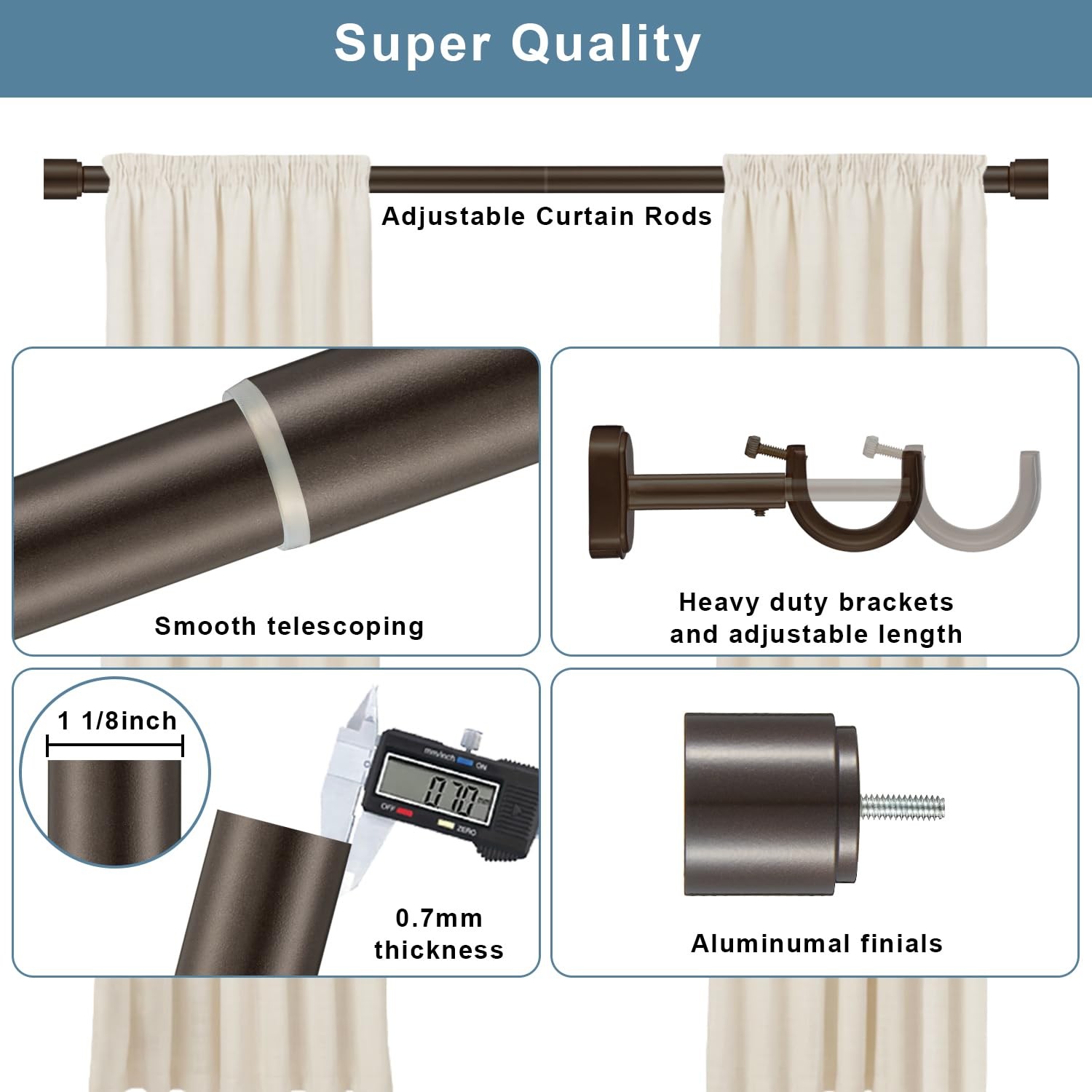 đ Product Description ăHeavy-Duty & Sturdy ConstructionăThis extra-thick 1 1/8-inch diameter curtain rod is built to hold heavy, luxurious curtains without bending or sagging! Made with premium iron for the rod (0.7mm thickness) and reinforced aluminum alloy brackets & finials, itâs stronger and more durable than flimsy rodsâperfect for blackout drapes, layered curtains, or oversized windows.,ăThick Adjustable Brackets for Maximum SupportăUnlike cheap brackets that wobble, our heavy-duty, thickened brackets provide rock-solid stabilityâeven for the heaviest curtains. The sleek hidden screw design keeps your wall looking clean and polished.,ăEffortless Adjustable LengthăThe smooth telescoping design lets you customize the length in secondsâno tools needed! It is adjustable , size option:36-72", 48-84", 72-144", 144-240", can fit standard windows, bay windows, or even wide sliding doors. No more struggling with fixed-length rods!,ăEasy Assembly, No Hassleă No complicated tools or steps! This large curtain rod is easy to assemble, 36-72â and 48-84â includes 2 poles, 72-144â includes 3 poles, 144-240â includes 5 poles. just put them together, adjust length, install brackets, then finished installation.,ăPremium Finishes for Any Decoră 4 elegant color finishes: Matte Black, Brushed Nickel, Warm Gold, Dark Bronze. Each finish is scratch-resistant and fade-proof, blending seamlessly with farmhouse, contemporary, or traditional styles.,ăKindly NotesăWhen you order curtain rods, pls measure your window size, the curtain rods size you choose is equal your window size+overlap you leave on both size, overlap usually suggest 2-6inch each window side. You can refer to the form on our product page. đ Specifications size 36-72" color Dark Bronze model JD-138 material Iron itemWeight 3.25 pounds partNumber JD-138 manufacturer Joodxoe productDimensions 1.1 x 1.1 x 72.0 inches