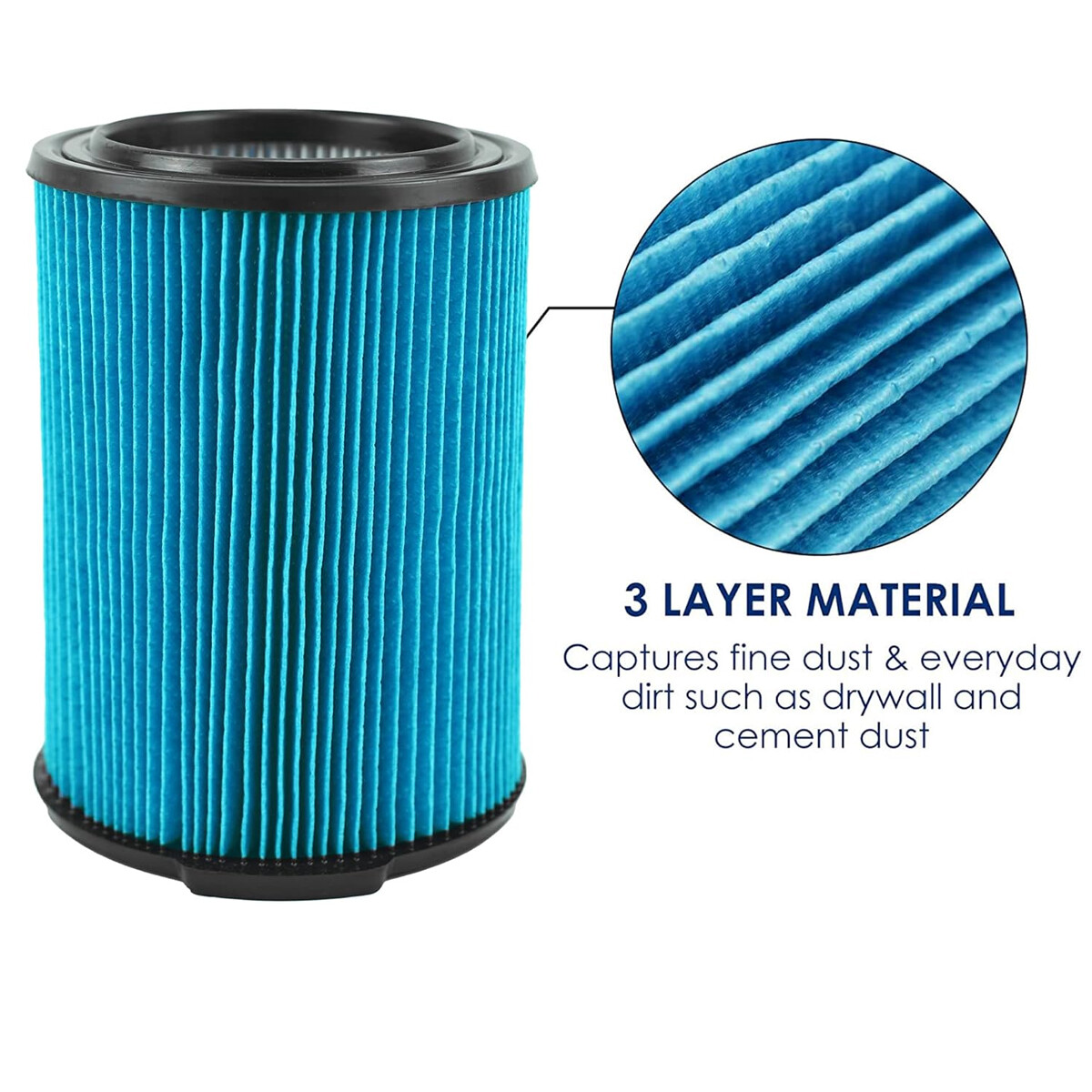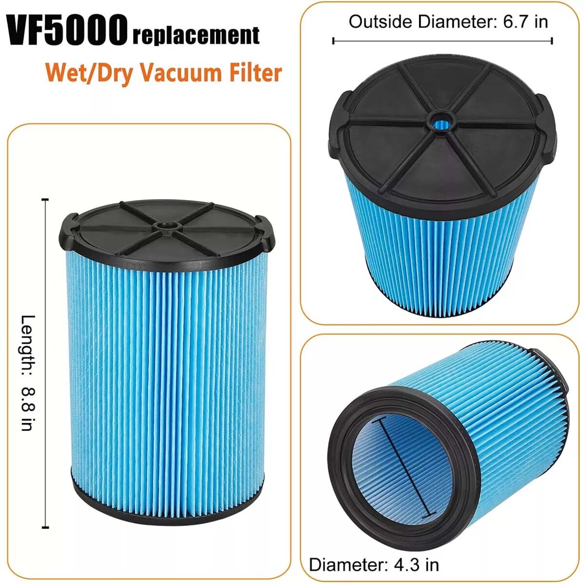 Product Details: VF5000 replacement filter perfectly fits for Ridgid 5-20 gallon Wet Dry Vacuum Cleaners Specifications: Color:Blue Material: Filter Paper, PU 🛠️ Brand new and high quality 🛠️ For VF5000 Replacement Filter for Ridgid 6-20 Gallon Wet Dry Vac, fits RV2400A 🛠️ Ridgid VF5000 is 1-Pack 3-layer pleated FINE DUST filter compatible with Qwik-Lock design. It is washable and reusable. 🛠️ Compatible with all Ridgid vacs from 6 to 20 gallons also Husky 6 to 9 gallons shop vacuum cleaners and more 🛠️ This filter is great for fine dust such as sawdust, dirt from basement or garage, drywall dust, cement dust, cold ashes from fireplaces or grills, and fine powders such as flour, talcum, and chalk 🛠️ Please replace your filter in very 6-12 months to keep your machine fresh and clean. 🛠️ Size:185mm*185mm*235mm Compatible model: For Ridgid WD0671 For Ridgid WD0970 For Ridgid WD06700 For Ridgid WD0671EX0 For Ridgid WD1270 For Ridgid WD1450 For Ridgid WD1851 For Ridgid WD1680 For Ridgid WD1956 For Ridgid RV2400A For Ridgid WD09700 For Ridgid WD0970M0 For Ridgid WD0970EX0 For Ridgid RV2400HF For Ridgid RV2600B For Ridgid 0671EX0 Package includes: 1 x VF5000 Replacement Wet/Dry Washable Vacuum Garage Shop Vac Pleated Filter On May 25, 2025 at 02:46:38 PDT, seller added the following information: