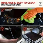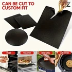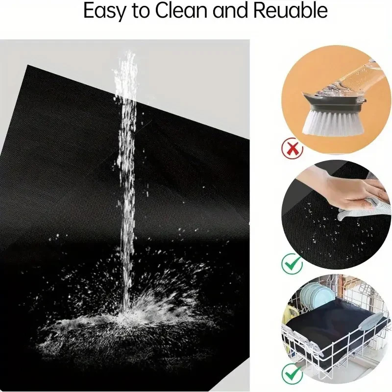 The product is a reusable baking mat measuring 12.9" x 15.7" and is designed to be used at the bottom of ovens, both electric and gas. It is suitable for use in baking, roasting, bread making, and on baking racks. The mat is non-stick, easy to clean, and durable, with a heat-resistant surface that does not contain harmful chemicals like BPA and PFOA. Its rectangular shape and black color make it versatile for various baking needs.