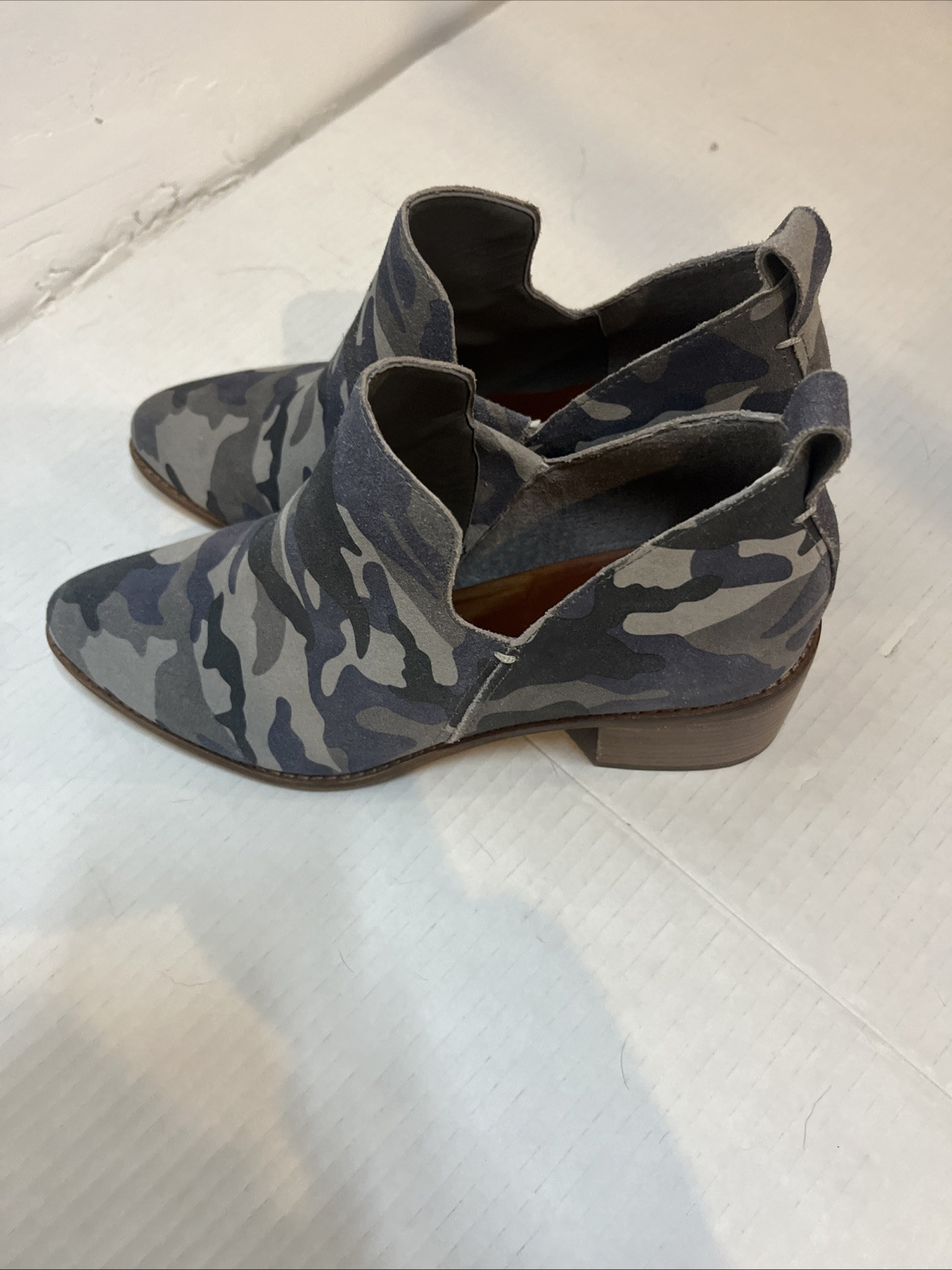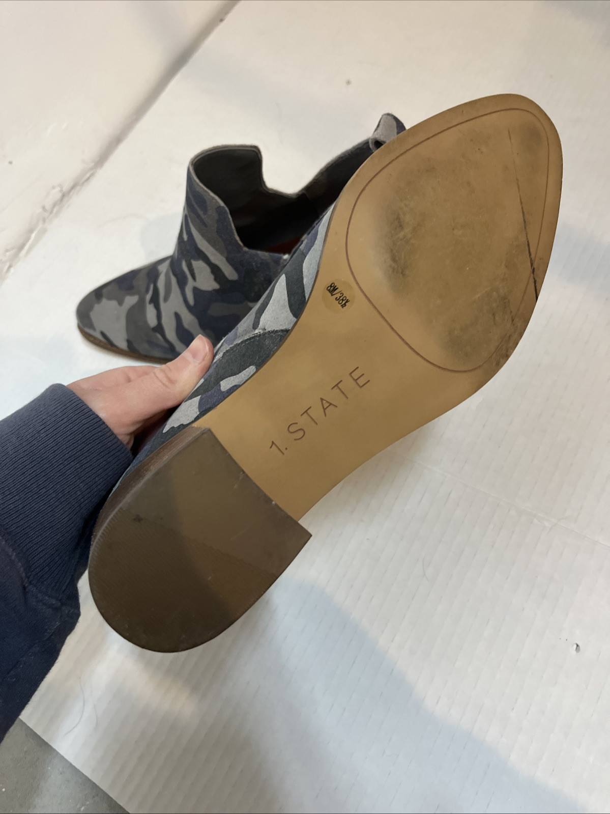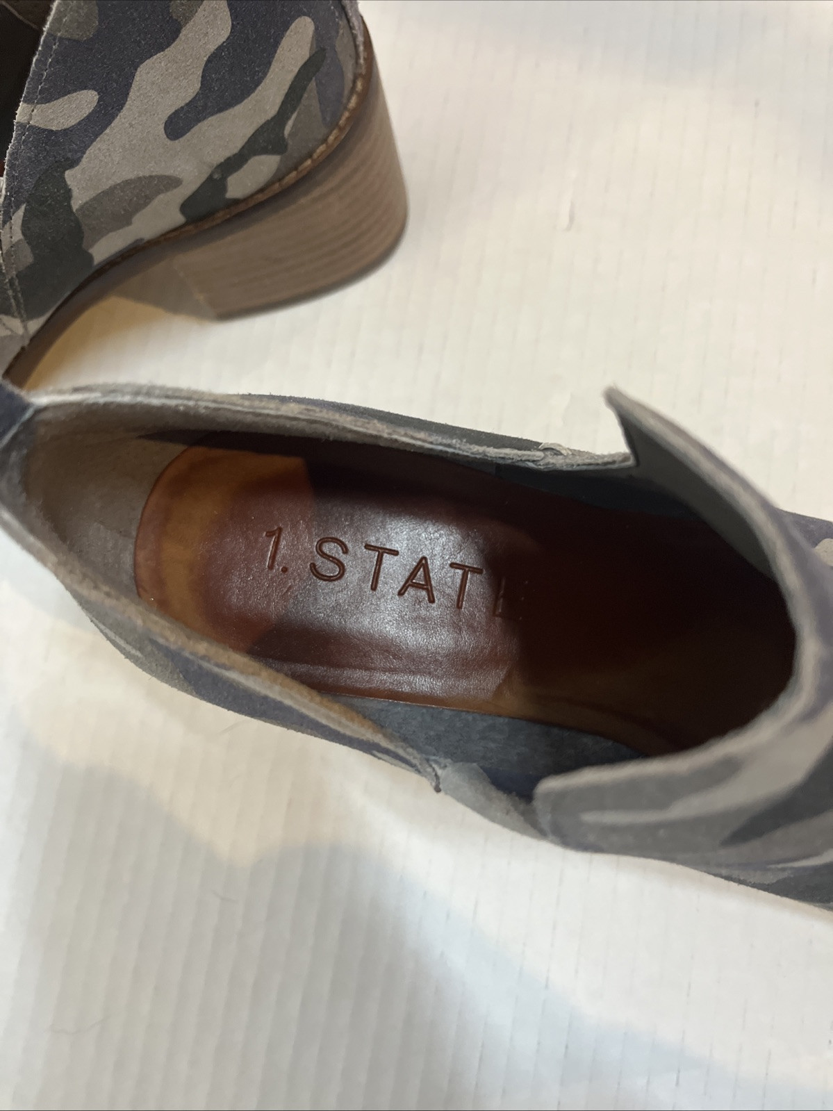 1. State Genuine Leather Suede Green Camo Idania Block Heel Bootie Slip On Sz 8M. Condition is Pre-owned. Shipped with USPS Ground Advantage.