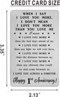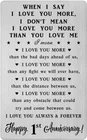 Happy 1st Anniversary Wallet Card Gifts - When I say I love you more, I don't mean I love you more than you love me. I mean I love you more than the bad days ahead of us, I love you more than any fight we will ever have, I love you more than the distance between us, I love you more than any obstacle that could try and come between us, I love you always forever, Happy 1st anniversary! 1 Year Anniversary Card Gifts- 1 year anniversary gifts for boyfriend, 1st wedding anniversary card, 1 year anniversary gifts for husband, best anniversary wallet card for husband wife fiancé fiancee One Year Wedding Anniversary Gift Ideas - The engraved wallet card awesome and simple, was a nice wedding anniversary gift that fits in a wallet for him or her to carry around. When your dear open the wallet, will feel your love everywhere with you Engraved Steel Wallet Cards Inserts - The romantic anniversary keepsake is Made with Stainless Steel, permanent laser engraved, will not tarnish or change color, not easy bend, could be keep for a lifetime Fits Perfectly In Wallet - Approximately credit card size 3.38"x2.13"x0.03", sturdy and lightweight, easy to put in any wallet. Packaged with free blue gift envelope, timeless romantic anniversary gifts, beautiful and ready for gift giving Product Description When I say I love you more, I don't mean I love you more than you love me. I mean I love you more than the bad days ahead of us, I love you more than any fight we will ever have, I love you more than the distance between us, I love you more than any obstacle that could try and come between us, I love you always forever, Happy anniversary! Fits Perfectly In Wallet The engraved wallet card awesome and simple, was a nice wedding anniversary gift that fits in a wallet for him or her to carry around. When your dear open the wallet, will feel your love everywhere with you One-sided engraving The beautiful engraved wallet card is one-sided engraving, engraved some love message. Another sided no engraved, you can writing some message what you want. for example, you can writing her/ him name or date The same size as credit card Approximately credit card size 3.38"x2.13"x0.03" The romantic anniversary keepsake is Made with Stainless Steel Permanent laser engraved, will not tarnish or change color, not easy bend, could be keep for a lifetime Happy anniversary wallet card Packaged with free blue gift envelope, timeless romantic anniversary gifts, beautiful and ready for gift giving