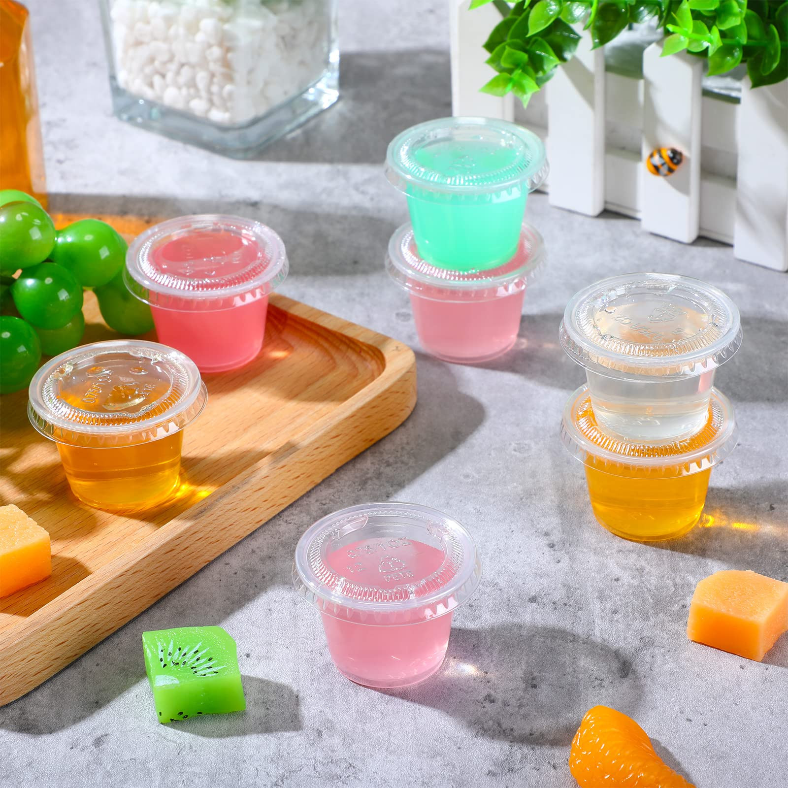 Package Contents: you will receive 1000 pieces of 1oz cups with lids, the sufficient quantity can meet your daily use and replacement, cups and lids are packaged separately, convenient for storage, will not take up too much of your space PET Material: the small plastic containers with lids are made of quality PET material, safe and clean, strong and not easy to break, you don't need to worry about punctures or leaks; When you are done with one, just throw it into the recycling bin Clear Plastic Condiment Cups: the condiment cups with lids are nice for displaying your signature sauces, coleslaw or household condiments; This cup with clear lid makes it easy to identify the contents while keeping the contents clean Leak-proof Design: the sealing lid of the plastic containers with lids snaps on quickly and securely, providing a strong seal and leak-proof function to prevent food or flavor spills inside Wide Range of Usages: these plastic salad dressing containers are nice for home and commercial use; The right size for samples, jelly balls, condiments, portion control, salad dressings, yogurt and so on