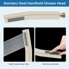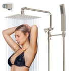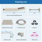 Great Shower Head Combo: 10 inches square rainfall shower head+anti-rust metal handheld shower head+71 inches stainless steel shower hose+11 inch shower head extension arm+3-Way water restrictor+adhesive shower head holder+washer Stainless Steel Handheld Showerhead: Very delicate water flows touch with your skin and brings you an extremely comfortable shower experience; High-quality metal and silicone nozzle, will last for many years use Rainfall Shower Head of 10 Inches: Made of certificated SUS 304 stainless steel to ensure rust resistance and durability; Ultra-thin design, a total of 144 splash jets for delivering a rain spray; The brass swivel ball connector can adjust to any angle Shower Extension Arm of 11 Inches: Made of solid brass, anti-rust for long-time use; Fits any rain shower head or handheld shower head, with height & angle adjustable Upgraded 3-Way Diverter Valve: Can be used with two showers at the same time, or with a shower head/rainfall shower head alone; Designed to be connected together with shower extension arm, prevent leaking and shaking
