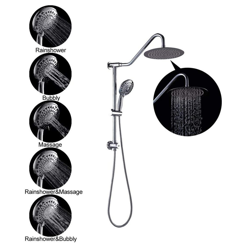 The Shower System redefines pure shower enjoyment with an all-in-one system that revitalizes you every time you step into the shower. The sleek, contemporary-style kit consists of a fixed 10 in. Rain showerhead and a 5 in. hand shower with a metal hose, as well as a 24.6 in. rail and all mounting supplies, including adhesive and optional screws. The hand shower offers four spray settingsRain, RainO2, Jet, and Massage.Features: Color/Finish: Chrome Diverter Type: 2 way Features: Adjustable Flow Rate, Ceramic Disc Valves, High Pressure Flow rate (gallons per minute): 1.75 Included Components: All Mounting Hardware, Hand Shower, Sprayer head, Supply Lines Mounting Type: Wall Mount Number of Spray Patterns: 1 Returnable: 180-Day Shower Head Size: Large Spray Pattern: 360 Degree, Rain Free Shipping Over $49.99* Details 10 Inch Chrome Rain Shower Head with Handheld Product Description: The Shower System redefines pure shower enjoyment with an all-in-one system that revitalizes you every time you step into the shower. The sleek, contemporary-style kit consists of a fixed 10 in. Rain showerhead and a 5 in. hand shower with a metal hose, as well as a 24.6 in. rail and all mounting supplies, including adhesive and optional screws. The hand shower offers four spray settingsRain, RainO2, Jet, and Massage. Features: Color/FinishChrome Diverter Type2 way FeaturesAdjustable Flow Rate, Ceramic Disc Valves, High Pressure Flow rate (gallons per minute)1.75 Included ComponentsAll Mounting Hardware, Hand Shower, Sprayer head, Supply Lines Mounting TypeWall Mount Number of Spray Patterns1 Returnable180-Day Shower Head SizeLarge Spray Pattern360 Degree, Rain StyleClassic,Glam,Modern