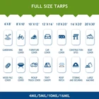⚠️【Note】Our products are all packaged in a blue waterproof cloth, so the packaging color does not represent the actual color of the product. If you receive a product and find that the exterior is blue, please do not mistakenly think that the wrong color has been sent. The product inside the packaging will be the actual color you ordered. If you have any questions, feel free to contact our customer service team. 【All Weather Tarp】Whether it's windy, rainy or snowy, our high-quality polyethylene waterproof tarp can handle it all! The all-weather tarp is constructed with 2 layers of polyethylene film, the 5mil and 10mil tarps come with a metal grommet every 3 feet, while the 16mil tarp has a metal grommet every 18 inches., allowing you to easily secure it in every corner. It offers wind, water, and UV protection, safeguarding any object from all extreme weather conditions. 【Finished Size】Crafted from durable polyethylene, our versatile tarp comes in sizes from 6 x 8 feet to 20 x 30 feet, with options in various colors and thicknesses (5Mil, 10Mil, and 16Mil). It's waterproof, moisture-proof, and dust-proof, ensuring long-lasting protection against tearing and rotting. Perfect for outdoor activities or home projects, the tarp offers strength, portability, and great value. 【Tear Resistance】The premium waterproof tarps feature heat-sealed seams and reinforced corners to prevent tearing. Made from pure, original, non-recycled polyethylene with a double-sided coating, our tarp has a flexible structure that's easy to fold. It provides ultimate durability and won't tear, crack or rot when used year-round, making it suitable for any residential and commercial use. If you're looking for a tarp that can last for years, this is the perfect choice. 【MULTIPURPOSE USE】waterproof tarp has a wide range of applications. Whether you need ground covers, tent flooring, RV and boat covers, backyard sunshades, or protection for damaged roofs and outdoor furniture, it offers the perfect coverage! It can also provide campers with a shelter from the wind, rain, or sun. Regardless of the application, our tarps offer a sturdier, more durable solution for long-term coverage or protection needs.