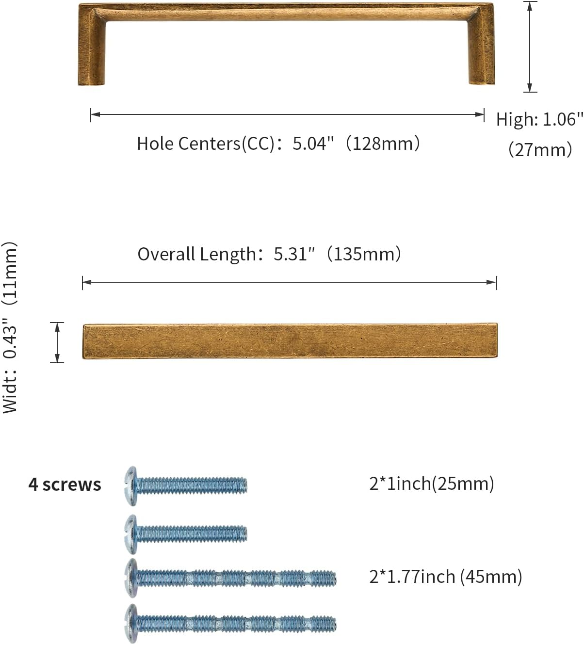 Material - Cabinet handles are made of zinc alloy with Antique Brass finish, which is more stable, while making your cabinets more refined and beautiful. Cabinet Pulls Dimensions - Hole Centers(CC):5"(128mm); Overall Length:5.31"(135mm); Width:0.43"(11mm), Projection: 1" (27mm) Fits Most Cabinets - We offer 1" (25mm) and 1.77" (45mm) mounting screws to help you mount most furniture of different thicknesses, Machine Screws Metric Size: M4 Versatile Appicatications - This Antique Brass cabinet handle is perfect for dressers, drawers, doors, cupboards, wardrobes, closets. The solid kitchen cabinet hardware solid zinc handle is a good helper to pull out the drawer quickly and easily. KNOKLOCK BRAND - We take your user experience very seriously, if you receive any quality problems with your cabinet pulls, we will solve them for you. Product Description Big changes in small things! Knoklock Technology specializes in the production and sale of all kinds of fine cabinet hardware. Bedroom Drawers Kitchen Cabinets Cupboard Bathroom Cabinet