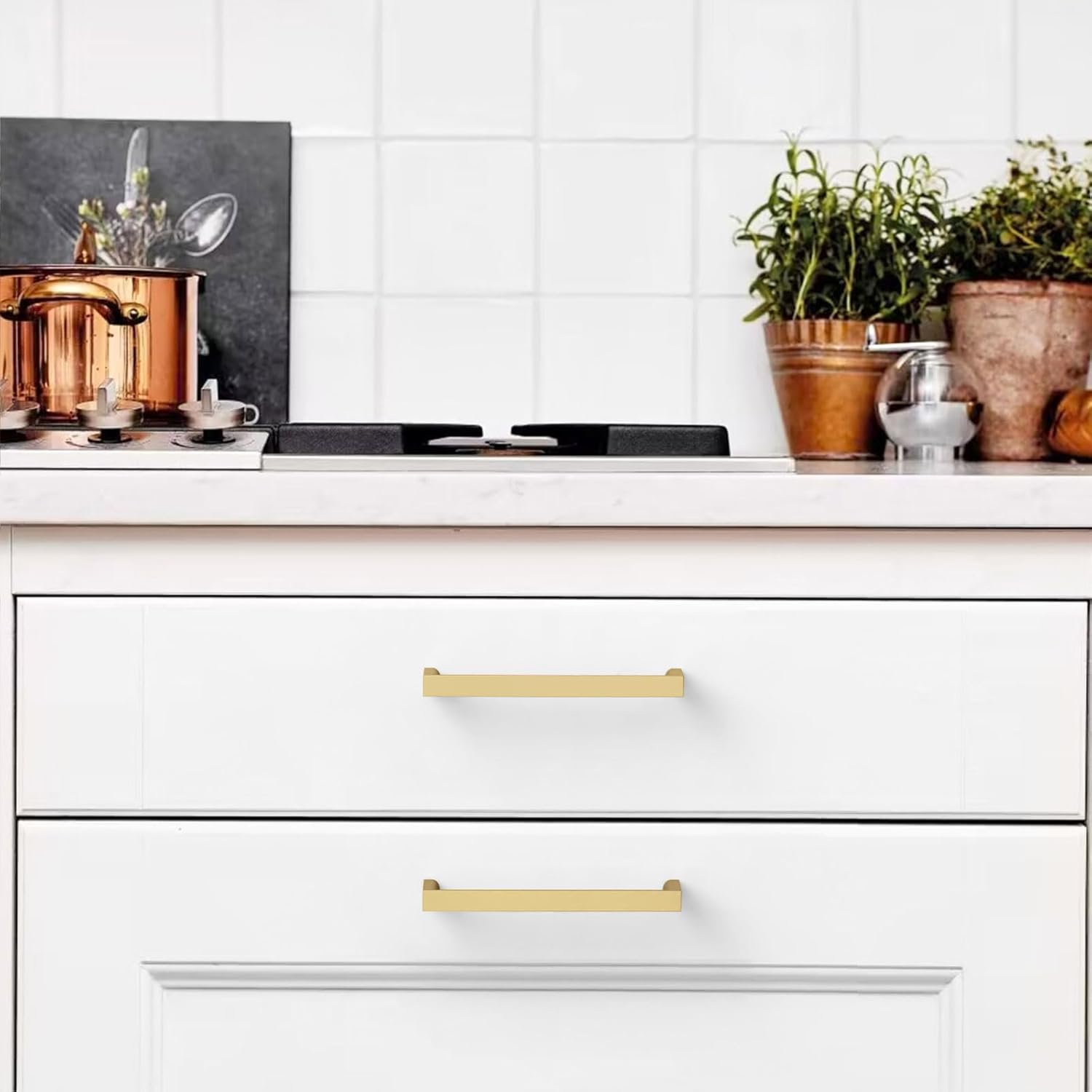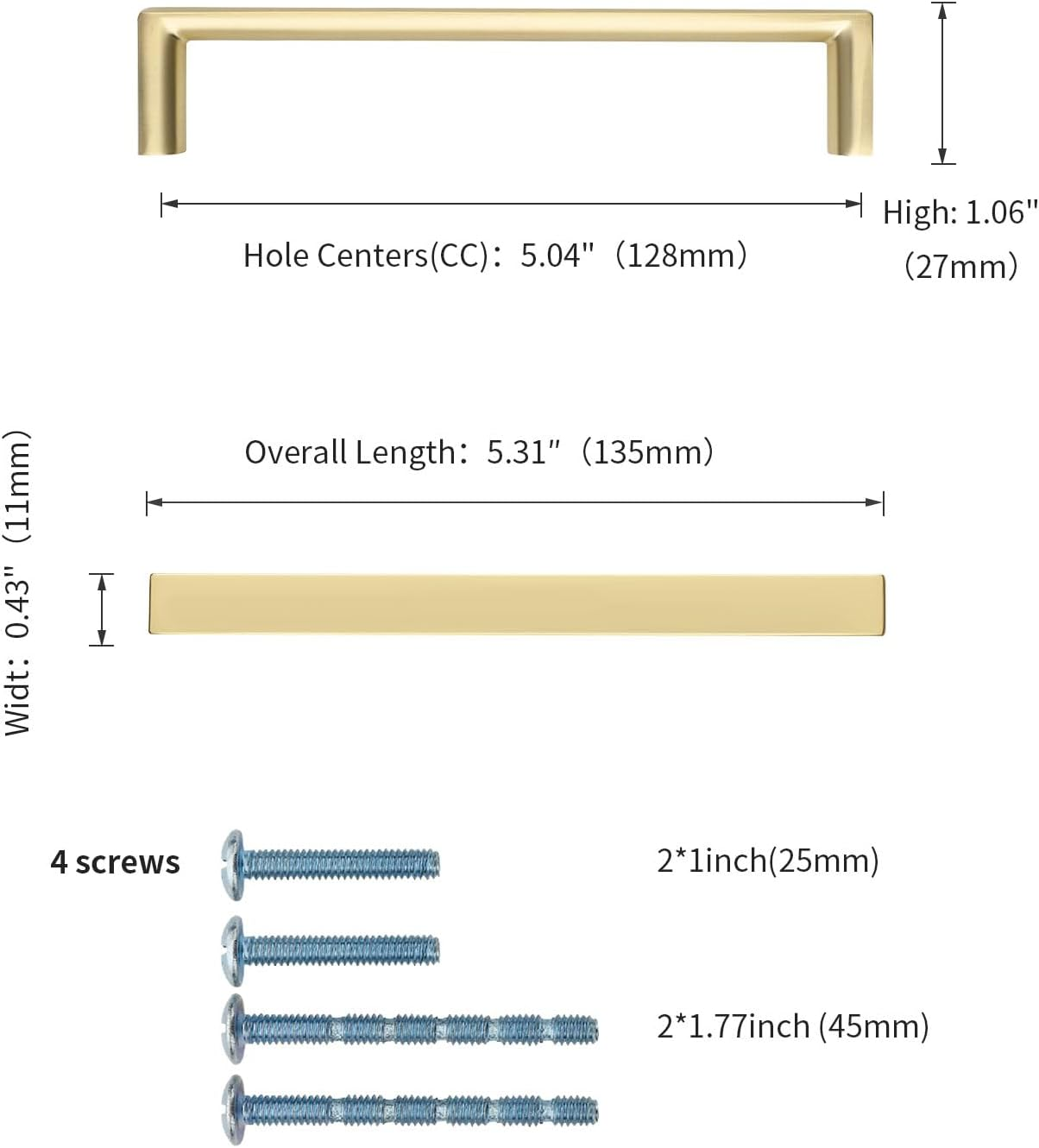 Material - Cabinet handles are made of zinc alloy with Gold finish, which is more stable, while making your cabinets more refined and beautiful. Cabinet Pulls Dimensions - Hole Centers(CC):5"(128mm); Overall Length:5.31"(135mm); Width:0.43"(11mm), Projection: 1" (27mm) Fits Most Cabinets - We offer 1" (25mm) and 1.77" (45mm) mounting screws to help you mount most furniture of different thicknesses, Machine Screws Metric Size: M4 Versatile Appicatications - This Gold cabinet handle is perfect for dressers, drawers, doors, cupboards, wardrobes, closets. The solid kitchen cabinet hardware solid zinc handle is a good helper to pull out the drawer quickly and easily. KNOKLOCK BRAND - We take your user experience very seriously, if you receive any quality problems with your cabinet pulls, we will solve them for you. KNOKLOCK 10 Pack 5 Inch(128mm) Kitchen Cabinet Handles Gold Cabinet Pulls Kitchen Cabinet Hardware Drawer Pulls for Cupboard Wardrobe