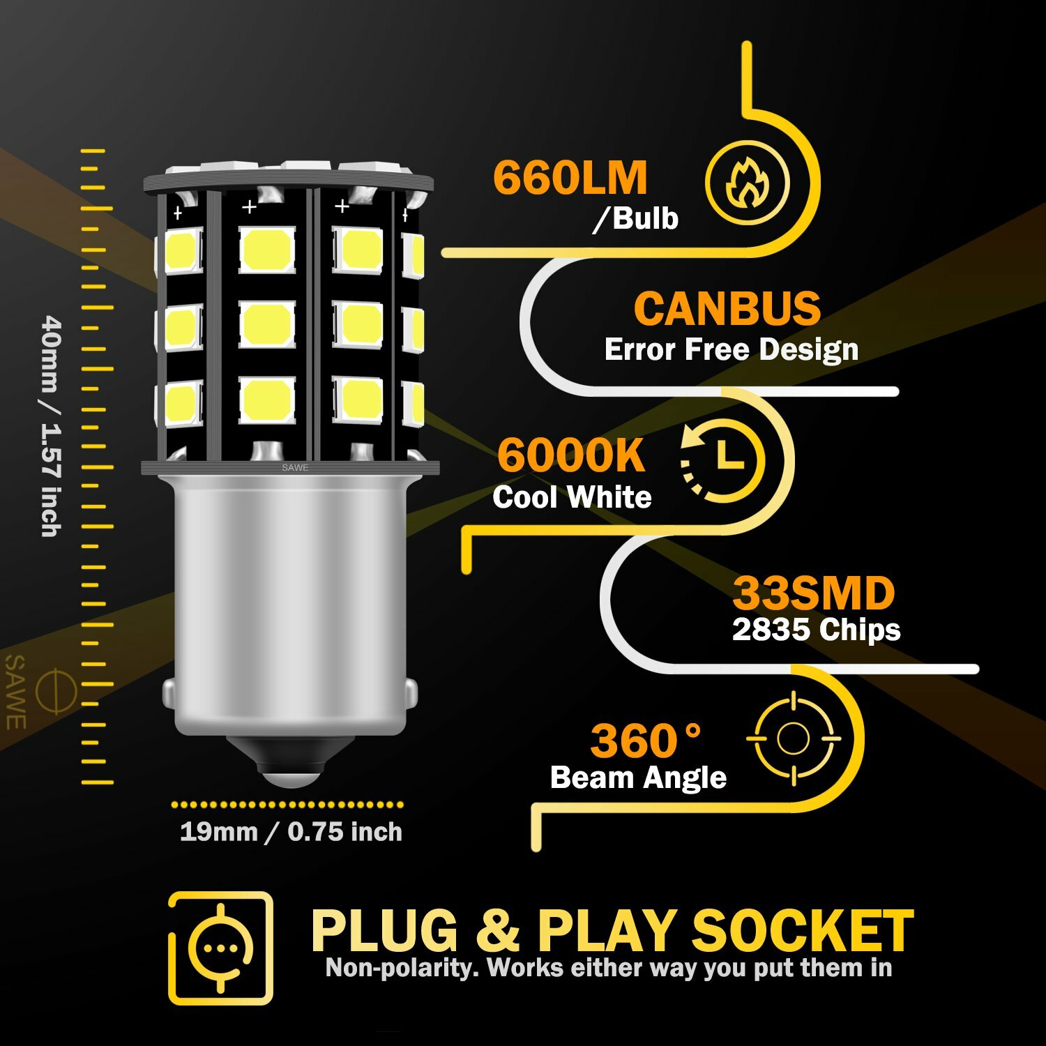 SUPER BRIGHT HIGH POWER BACKUP REVERSE LED THE BRIGHTEST: Our 2835 33smd LED is 2-3 times brighter light than the standard 5050 LED on the market THE SMARTEST: AC Digital Logic technology prevents flickering by adapting to the electronic pulses of your vehicle THE STRONGEST: All our LED using the latest technology to ensure a long lasting unit (50,000 hours) THE EASIEST: Quick Snap power connectors allow for easy plug-‘n’ play installation Quick Start: The LED bulb light up instantly (no waiting time) Package Contents: 10 x SAWE 1156 BA15S 2835 33smd LED RV Trailer Backup Reverse Light Bulbs White SUPER BRIGHT HIGH POWER BACKUP REVERSE LED THE BRIGHTEST: Our 2835 33smd LED is 2-3 times brighter light than the standard 5050 LED on the market THE SMARTEST: AC Digital Logic technology prevents flickering by adapting to the electronic pulses of your vehicle THE STRONGEST : All our LED using the latest technology to ensure a long lasting unit (50,000 hours) THE EASIEST: Quick Snap power connectors allow for easy plug-‘n’ play installation Quick Start: The LED bulb light up instantly (no waiting time) Package Contents: 10 x SAWE 1156 BA15S 2835 33smd LED RV Trailer Backup Reverse Light Bulbs White ( 90 days Manufacturer's Warranty directly from us!) LED Features: Lumens: 660LM /each Socket Type: 1156 BA15S Color Temperature: 6000K Chips: super bright 33smd 2835 imported chips Non-polarity Design : works either way, simply plug & play Common Use: reversal light, brake light, tail light, RV Trailer Interior Light , etc CANBUS Error Free: build-in CANBUS decoder can prevent error code or flickering for most vehicles Perfect Light Distribution: 33 pieces extremely bright & high power 2835smd chips, 360 degree illumination with no blind spot and shadow Non-Fading Brightness : build in constant current IC, ensure consistent lighting all the time and prevent the bulb from burning out when the voltage is unstable Fitment: This LED can fit more than one car, please check the “ Compatibility Table ” before check out. (Send us a message for more questions) Cross Reference Bulb Sizes: 1156 BA15S = 1073 1093 1129 1141 1159 1259 1459,etc. (For Reference Only) A Friendly Reminder: It may request to install the load resistor to avoid hyper flashing or error codes on dash when using for turn signal light Please check the LED sizes and type before purchasing, LEDs sizes are bigger than halogens Item Specifics Modified Item No To Fit Reverse Light Custom Bundle No Interchange Part Number 1156 1073 1093 1129 1141 1159 1259 1459 Bulb Color White Ballast Included No Bulb Size 1156 BA15S Type RV Trailer Camper Interior Lights Bulbs Lumens 660 Manufacturer Part Number 10S-1156-001-T02 Placement on Vehicle Front Rear Left Right Other Part Number 1619 1651 1680 3496 5007 5008 7506 7527 Brand SAWE Fitment Type Direct Replacement Color Temperature 6000K Number of Bulbs 10 Warranty 90 Day Voltage 12V UPC 726798698020 DESCRIPTION PAYMENT SHIPPING RETURN POLICY CONTACT US Shop Category Store Home Apple iPad Case ◈ iPad Mini 1 / 2 / 3 Case ◈ iPad Mini 4 (4th Gen) Auto LED Lights ◈ T10 168 194 ◈ Resistor ◈ 1156 ◈ 31 mm LED ◈ 41 mm LED ◈ BA9S ◈ Honda Interior LED Package ◈ Acura Interior LED Package ◈ Toyota Interior LED Package ◈ Scion Interior LED Package ◈ Subaru Interior LED Package ◈ Mitsubishi Interior LED Packag ◈ Mazda Interior LED Package ◈ Hyundai Interior LED Package ◈ Lexus Interior LED Package ◈ Nissan Interior LED Package ◈ Infiniti Interior LED Package ◈ Kia Interior LED Package ◈ BMW Interior LED Package ◈ Mercedes Interior LED Package ◈ Audi Interior LED Package ◈ Chevrolet LED Package ◈ Volkswagen LED Package ◈ Cadillac LED Package ◈ Chrysler LED Package ◈ Dodge Interior LED Package ◈ Ford LED Package ◈ Porsche LED Package ◈ GMC LED Package ◈ Mini LED Package ◈ Lincoln LED Package ◈ Jeep LED Package ◈ Hummer LED Package ◈ Sun Visor LED ◈ Rigid Loop LED ◈ 44 mm LED ◈ Strobe Warning Light ▷ Reverse,Signal, Brake LED ♢ T15 921 912 LED ♢ 3156 / 3157 ♢ 7440 / 7443 ♢ 1157 Bags ◈ Zip Lock Bags ◈ Static Bags Other Hot Item 10 x Ultra White 41MM 42MM 3014 36SMD Dome Map LED Light Bulbs 578 211-2 212-2 USD 13.99 4x 921 LED Reverse Light Canbus Error Free 912 T15 W16W Backup Bulb 2400LM White USD 8.67 6 x Ultra White 41MM 42MM 3014 36SMD Dome Map LED Light Bulbs 578 211-2 212-2 USD 10.44 10x 41mm 42mm 6SMD LED Dome Map Interior Light Bulbs 578 211-2 212-2 6000K White USD 10.98 4 x LED Work Light Flood SPOT Lights For Truck Off Road Tractor ATV Round 48W USD 19.98 Fast Shipping New List Item 8 x For 2014 - 2019 Chevy Corvette C7 Interior LED Lights Bulb Package - White USD 12.22 13 x For 2004 - 2012 Chevy Colorado Interior LED Lights Bulb Package Kit - White USD 13.18 16 x For 2015 - 2024 Chevy Colorado Interior LED Lights Bulb Package Kit - White USD 15.08 11 x For 2005 - 2013 Chevy Corvette C6 Interior LED Lights Bulb Package - White USD 12.30 10 x For 2011 - 2019 Chevy Cruze Interior LED Lights Bulb Package Kit - White USD 12.29 Help & Info Payment Policy Shipping Policy Return Policy FAQ About Us 10 x SAWE 1156 BA15S 2835 33smd LED RV Trailer Backup Reverse Light Bulbs White SUPER BRIGHT HIGH POWER BACKUP REVERSE LED THE BRIGHTEST: Our 2835 33smd LED is 2-3 times brighter light than the standard 5050 LED on the market THE SMARTEST: AC Digital Logic technology prevents flickering by adapting to the electronic pulses of your vehicle THE STRONGEST : All our LED using the latest technology to ensure a long lasting unit (50,000 hours) THE EASIEST: Quick Snap power connectors allow for easy plug-‘n’ play installation Quick Start: The LED bulb light up instantly (no waiting time) Package Contents: 10 x SAWE 1156 BA15S 2835 33smd LED RV Trailer Backup Reverse Light Bulbs White ( 90 days Manufacturer's Warranty directly from us!) LED Features: Lumens: 660LM /each Socket Type: 1156 BA15S Color Temperature: 6000K Chips: s