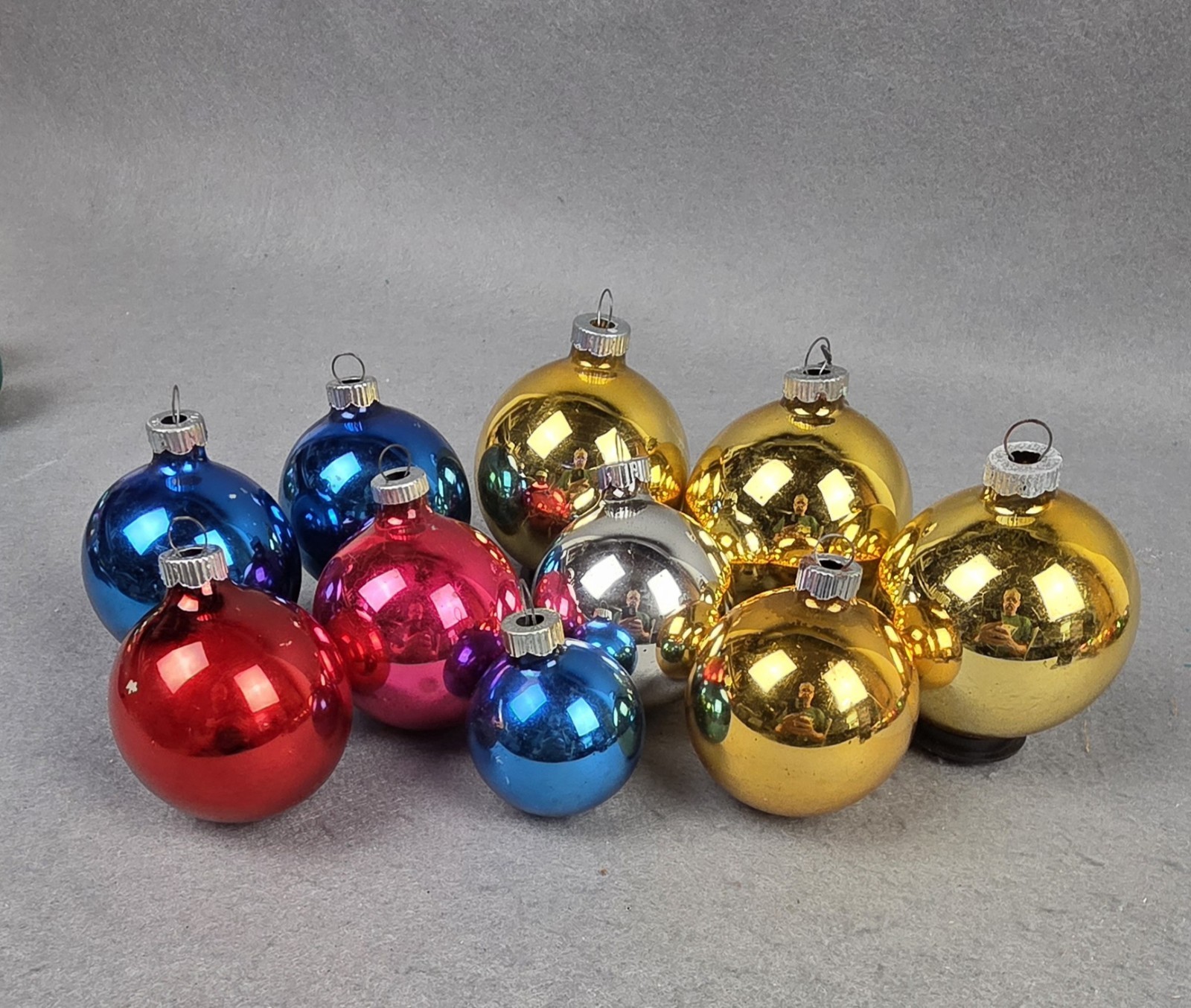 You are viewing a set of 10 vintage mixed sizes and colors Shiny Brite Mercury Glass Christmas ornaments, these have been loved over the years and have undergone color loss over time and some discoloration, adding to their nostalgic charm, be sure to view all photos for individual condition. The ornaments feature different colors; Magenta, Red, Blue, Silver and Gold in various sizes; 1.75", 2.25" and 2.5". Each ornament has a Shiny Brite cap, and all of them are made of glass, making them a valuable addition to any Christmas decor collection. Because most items I list are used be sure to view all photos as they are part of description and condition. Also be sure to view the last photos for dimensions. Reasonable offers are always welcome and will be considered. Thanks for viewing. I research all items I sell and do my best to list correct descriptions and information. If I missed something and you would like additional information please contact me before you bid or buy. The items I sell are acquired from various local sources and I use recycled packing materials so I can not guarantee that either come from smoke free or pet free environments, please keep this in mind before you purchase. EBAY International Shipping I use the Ebay International Shipping Program on all parcels leaving the United States. Ebay calculates and collects all charges for international shipments. All information on this program, how it works and its benefits can be viewed on Ebay's website.
