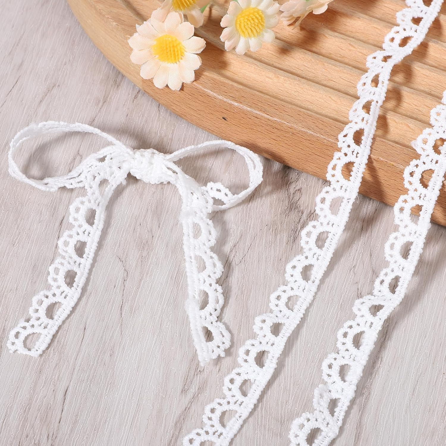Product Description: Add a touch of elegance and vintage charm to your DIY projects with this 10-yard white lace trim . Featuring a delicate crochet scalloped edge and hollow design, this lace ribbon is perfect for sewing, embroidery, gift wrapping, weddings, and craft decorations . Crafted from durable polyester , the lace trim is soft, breathable, and long-lasting , making it ideal for repeated use in crafts, bouquets, tablecloths, headpieces, hats, or garment embellishments . Its 1/2-inch (1.2 cm) width ensures versatile application while maintaining a refined and delicate appearance . Whether decorating gifts, creating personalized wedding décor, or adding intricate details to your sewing projects, this white crochet lace trim elevates any design with a timeless vintage aesthetic . Key Features Elegant Vintage Design – Delicate scalloped crochet pattern adds sophistication to projects. Premium Material – Made of durable polyester, soft, breathable, and long-lasting. Perfect Size – 1/2 inch (1.2 cm) wide and 10 yards long for versatile crafting. Easy to Use – Cut to desired length or shape for DIY crafts, gift wrapping, or sewing. Wide Application – Ideal for sewing, bridal décor, bouquets, tablecloths, headpieces, and hats. Craft & Decor Ready – Adds charm to gifts, wedding decorations, and personalized projects. High-Quality Finish – Maintains shape and elegance for professional-looking results. Product Details Color: White Material: Polyester Width: 1/2 inch (1.2 cm) Length: 10 yards Weight: 40g Packing List: 10 yards of lace trim Frequently Asked Questions (FAQs) 1. What is the length of this lace trim? The lace ribbon is 10 yards (30 feet) long, suitable for multiple projects. 2. What is the width of the lace? The trim is 1/2 inch (1.2 cm) wide. 3. What material is this lace made of? It is made from durable, soft, and breathable polyester. 4. Can I cut this lace to size? Yes, it can be easily cut to your desired length or shape. 5. Is it suitable for sewing projects? Absolutely, perfect for embellishing garments, tablecloths, or hats. 6. Can I use this for wedding decorations? Yes, ideal for bouquets, gift wrapping, headpieces, and wedding décor. 7. Is the lace durable? Yes, the polyester material ensures long-lasting use and maintains its shape. 8. Can it be used for craft projects? Yes, it is perfect for DIY crafts, scrapbooking, and personalized designs. 9. Is the lace soft and flexible? Yes, it is soft, breathable, and easy to work with. 10. Can it be combined with other decorations? Yes, it works beautifully with ribbons, flowers, beads, and other decorative elements. 11. How many yards are included? The package contains a total of 10 yards of lace trim. 12. Is the lace vintage style? Yes, it features a classic crocheted scalloped edge for a timeless, elegant look.