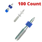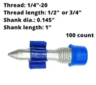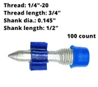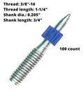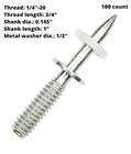 ICC-ES ESR-1530 certified pins Includes 100 threaded studs 1/4"-20 threaded studs: Item No. Thread Length Shank Length Description Box Case 3/4" With 1/2" plastic and metal washer M1/4-19-25D12 1" 100 1000 M1/4-19-32D12 1-1/4" 100 1000 1/2" With .300" thread cap and rubber flute M1/4PH-13-25F10 1" 100 1000 M1/4PH-19-13F10K 3/4" 1/2" 100 1000 M1/4PH-19-25F10 1" 100 1000 M1/4PH-19-32F10 1-1/4" 100 1000 3/8" - 16 Threaded Studs: Item No. Thread Length Shank Length Description Box Case 1-1/4" With rubber flute M3/8-32-19F10K 3/4"k 100 1000 M3/8-32-25F10 1" 100 1000