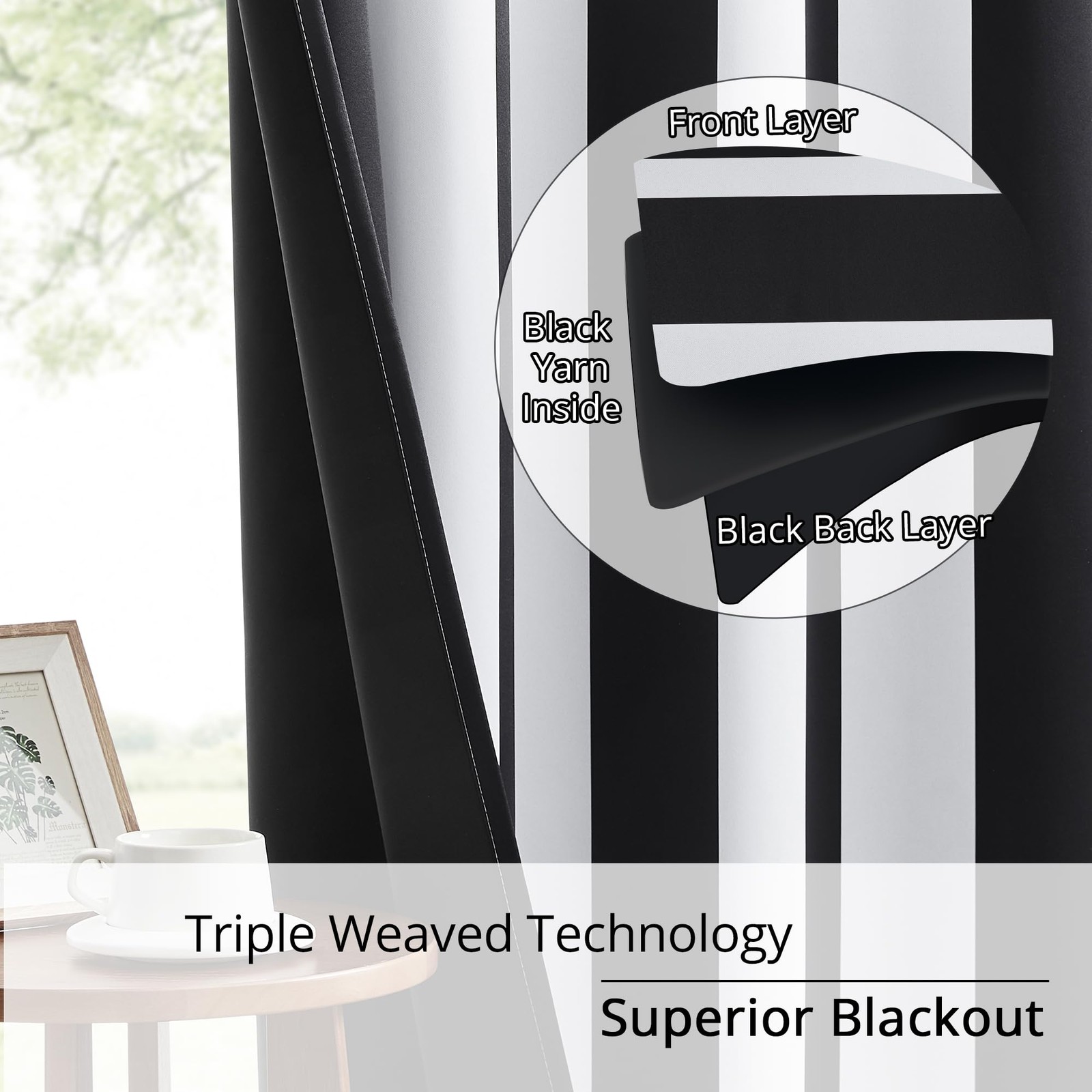 Transform your home with our 100% Blackout Black and White Stripe Curtains, combining timeless style with ultimate functionality. These curtains feature a classic Black and White Stripe pattern, perfect for adding elegance and sophistication to any space while ensuring complete light control and privacy. Stylish Black and White Stripe Pattern: Classic Black and White Stripe design adds sophistication to any room, blending perfectly with modern or traditional decor. 100% Blackout: Completely blocks out sunlight and UV rays, ensuring optimal privacy and restful sleep any time of day. Durable Black Backing: The back of the curtains is solid black, made with yarn-dyed black for exceptional durability and excellent colorfastness under sunlight. Thermal Insulation for Energy Savings: Helps regulate indoor temperatures by keeping the heat out in summer and retaining warmth in winter, improving energy efficiency and reducing utility costs. Noise Reducing & Peaceful: The thick, high-quality fabric reduces outside noise, creating a quiet and serene environment perfect for sleeping, working, or relaxing. Easy Installation & Maintenance: Comes with a grommet top design for effortless hanging on most standard curtain rods. Machine washable fabric ensures easy care and long-lasting use.