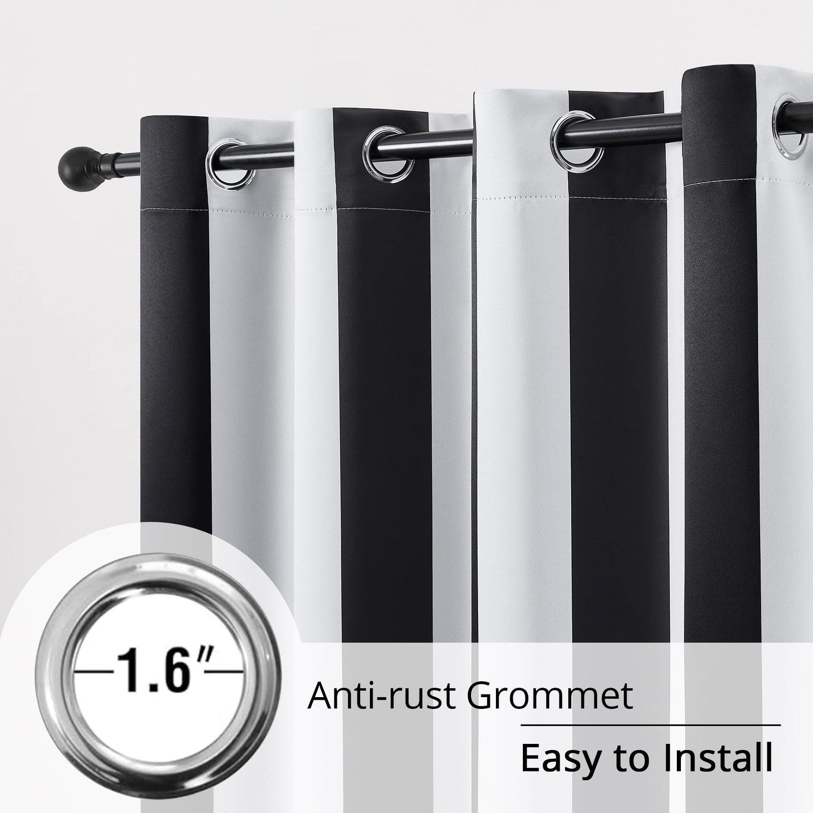 Transform your home with our 100% Blackout Black and White Stripe Curtains, combining timeless style with ultimate functionality. These curtains feature a classic Black and White Stripe pattern, perfect for adding elegance and sophistication to any space while ensuring complete light control and privacy. Stylish Black and White Stripe Pattern: Classic Black and White Stripe design adds sophistication to any room, blending perfectly with modern or traditional decor. 100% Blackout: Completely blocks out sunlight and UV rays, ensuring optimal privacy and restful sleep any time of day. Durable Black Backing: The back of the curtains is solid black, made with yarn-dyed black for exceptional durability and excellent colorfastness under sunlight. Thermal Insulation for Energy Savings: Helps regulate indoor temperatures by keeping the heat out in summer and retaining warmth in winter, improving energy efficiency and reducing utility costs. Noise Reducing & Peaceful: The thick, high-quality fabric reduces outside noise, creating a quiet and serene environment perfect for sleeping, working, or relaxing. Easy Installation & Maintenance: Comes with a grommet top design for effortless hanging on most standard curtain rods. Machine washable fabric ensures easy care and long-lasting use.