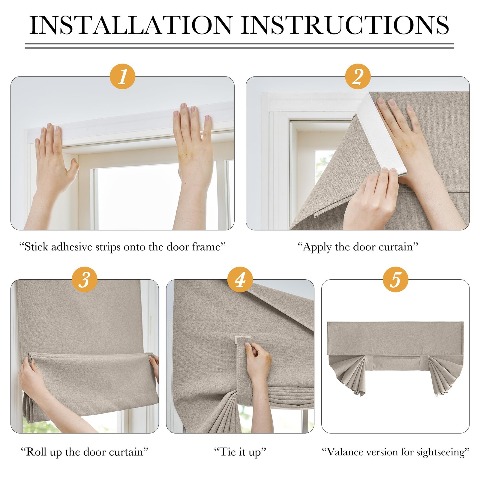 100% Blackout Linen Door Curtains with Adhesive Strips, 1 Panel Our blackout door curtains block 100% of light and UV rays. Includes 1 panel + adhesive strips for easy installation. Perfect for French doors, front door, and back doors. Thermal Insulated Energy-saving fabric reduces heat transfer by about 30%. Keep rooms cool in summer and cozy in winter while enjoying peaceful privacy. 4 Size Options for Every Space 8"x36" for classroom narrow sidelights | 26"x40" for standard doors | 12"x69" for sidelight windows | 26"x69" for standard doors | 36"x72" for wider doors. Choose your perfect fit! No Tools Needed Installation Skip curtain rods! Attach directly to glass/smooth surfaces in 3 minutes using included adhesive strips. Adjustable for temporary or permanent use. Luxury Feel & Easy Care Silky-soft 100% polyester. Machine wash cold, tumble dry low – maintains like-new quality for years. Package Includes: 1 premium blackout curtain panel (26"W x 69"L) + 1 adhesive strip. Perfect for French door, front door and back door window. Total Blackout & Privacy: Enjoy complete privacy and the perfect sleep with our fully blackout door curtain. It blocks 100% of light, creating a dark, peaceful space. Ideal for shift workers, nap lovers, and anyone seeking restful sleep. Diverse Colors and Sizes: Choose from a wide array of colors and sizes to meet your unique needs. Whether you're decorating your doors in a bedroom, living room, dining room, or kitchen, these blackout linen door curtains blend seamlessly into any space in your home. Easy Installation & No Tools Needed: Skip the rods! Attach directly to glass or smooth surfaces using the adhesive strip. Follow our step-by-step guide for a seamless setup in minutes. Easy Care: Easy to maintain and machine washable. Use only non-chlorine bleach & warm iron when needed. Tumble dry low.
