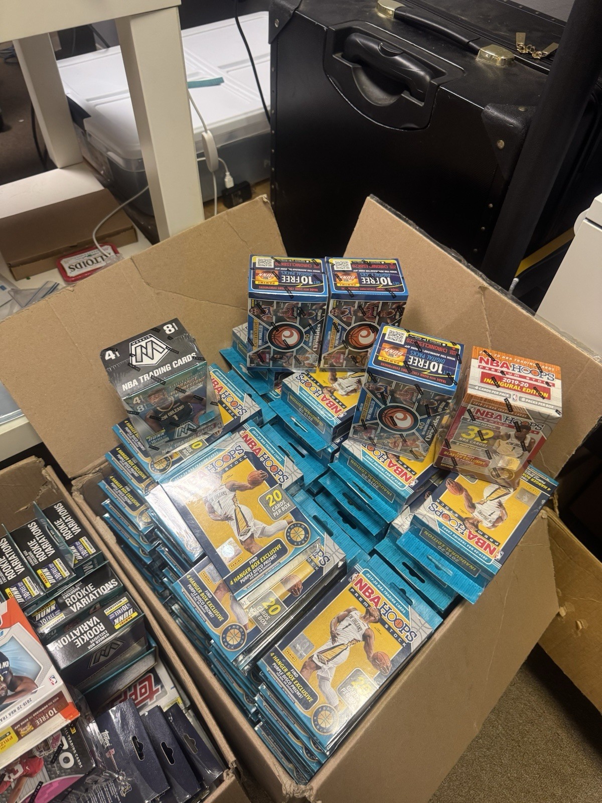 The product is a lot of 100 unopened 2019-20 Panini NBA Hoops Premium Stock hanger boxes. Each box contains 20 standard-sized trading cards featuring players from the National Basketball Association (NBA). Manufactured by Panini, these boxes include cards from the 2019-20 season and represent multiple NBA teams. This lot offers collectors the opportunity to potentially uncover highly sought-after cards and enjoy the thrill of opening packs to find hidden gems. PLUS 5 Free Blasters