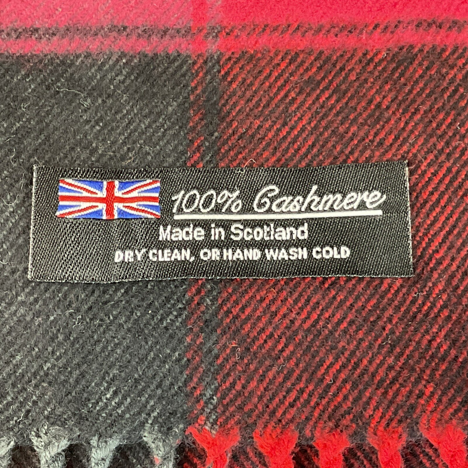100% Cashmere red, pink, black, and gray tartan plaid scarf with fringe. Made in Scotland. Dry clean or hand wash. Excellent preowned condition. Please see photos for additional details.