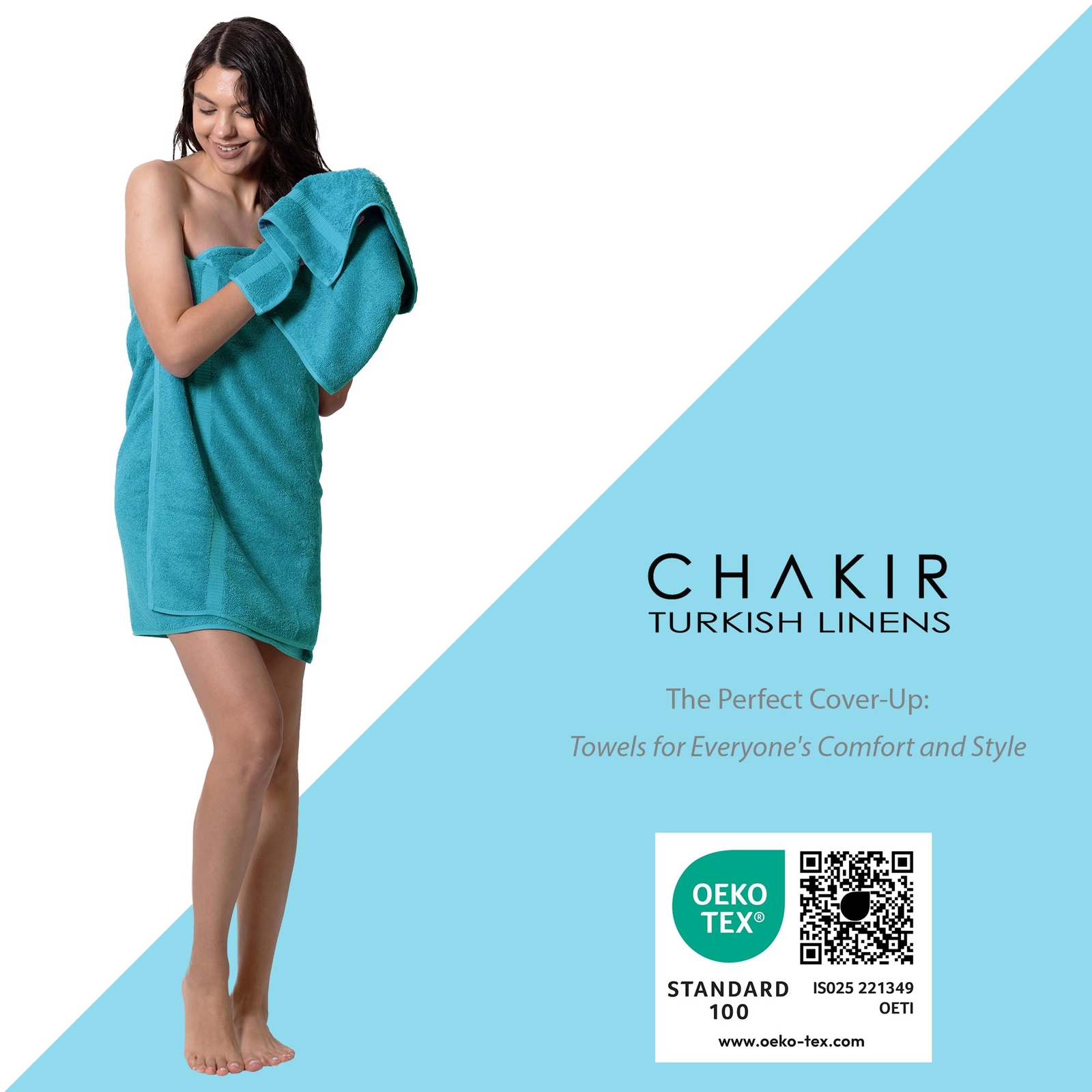 | Hotel & Spa Quality 100% Cotton Premium Turkish Towels | Soft & Absorbent (4-Piece Bath Towels, Aqua) PREMIUM TURKISH TOWELS: Crafted from 100% ring spun premium cotton, these towels offer exceptional absorbency and a soft, luxurious feel. Experience the spa-like indulgence within the comfort of your home. SET INCLUDES: This set consists of 4 bath towels sized 27 by 54 inches. These excellent and functional measurements are ideal for the everyday purposes of these towels. DURABLE AND LONG-LASTING: With a double-stitched hem and a natural weave, our towels are designed for lasting durability and strength, ensuring they withstand regular use and frequent washing without losing their quality. SAFE: We care about your well-being and the environment. Our towels are OEKO-TEX STANDARD 100 certified and tested for harmful substances, guaranteeing that they are free from any harmful chemicals, making them safe for you and your loved ones. THE PERFECT GIFT: Whether it's a housewarming, wedding, birthday, anniversary, or holiday celebration like Christmas or Thanksgiving, our high-quality towels make a perfect gift choice. Treat your loved ones to the ultimate in comfort and luxury with these exquisite bathroom towels. EXCEPTIONAL TURKISH TOWELS These high-quality hotel and spa collection towels are now available to you! Made from 100% long staple, super absorbent and natural Turkish cotton, our towels will give you the feel of luxury comfort. Chakir Linen towels will give your bathroom the aura of being in a beautiful resort, because of its relaxing touch after a long and stressful day. We have been manufacturing Turkish towels for over 20 years and we are experts in our craft of producing high quality cotton towels and pride ourselves on only making the finest. THE DIFFERENCE IN OUR TURKISH TOWELS! PREMIUM TURKISH COTTON! Turkish cotton is a premium cotton that has extra-long fibers, which makes Turkish towels delightfully absorbent! These towels are also known to become softer, fluffier, and more absorbent with each wash due to its unique material. The double-stitched hem and the natural weave on our towels guarantee durability and strength. Our towels are also Oeko-tex and ISO 9001 certified meaning the towels are free from harmful chemicals and are safe for you and the environment. EASY CARE STEPS! STEP 1: Wash towels in cold water before first use (The cold first wash will open up the fibers to make it more plush) We recommend that you soak the towels in cold water for 12 hours and then hang them to dry for maximum absorbency and softness. Please AVOID fabric softener, dryer sheets and/or bleach as the chemicals will only reduce the softness of the towels. Step 1 is not to be repeated afterwards just continue step 2! STEP 2: Tumble dry towels on low heat. SATISFACTION GUARANTEE! You will love the soft, luxurious feel and the quality of first-rate luxury hotel and spa collection towels. If 100% satisfaction is not met our customer service team would be happy to hear your concerns. Shipping We offer FREE shipping on all orders! We ship within Three business days of payment, usually sooner. We use a selection of shipping services such as UPS, FedEx, USPS etc. We only ship to the lower 48 states, no APO/FPO addresses or PO Boxes allowed. Local pickups and combined shipping options are not provided at this time. Return You can return a product for up to 30 days from the date you purchased it. Any product you return must be in the same condition you received it and in the original packaging. Please keep the receipt. Payment We accept payment by any of the following methods: PayPal Please pay as soon as possible after winning an auction, as that will allow us to post your item to you sooner! Feedback Customer satisfaction is very important to us. If you have any problem with your order, please contact us and we will do our best to make you satisfied. Contact Us If you have any queries, please contact us via ebay. We usually respond within 24 hours on weekdays. Please visit our eBay store to check out other items for sale! Thank you for shopping at our store.