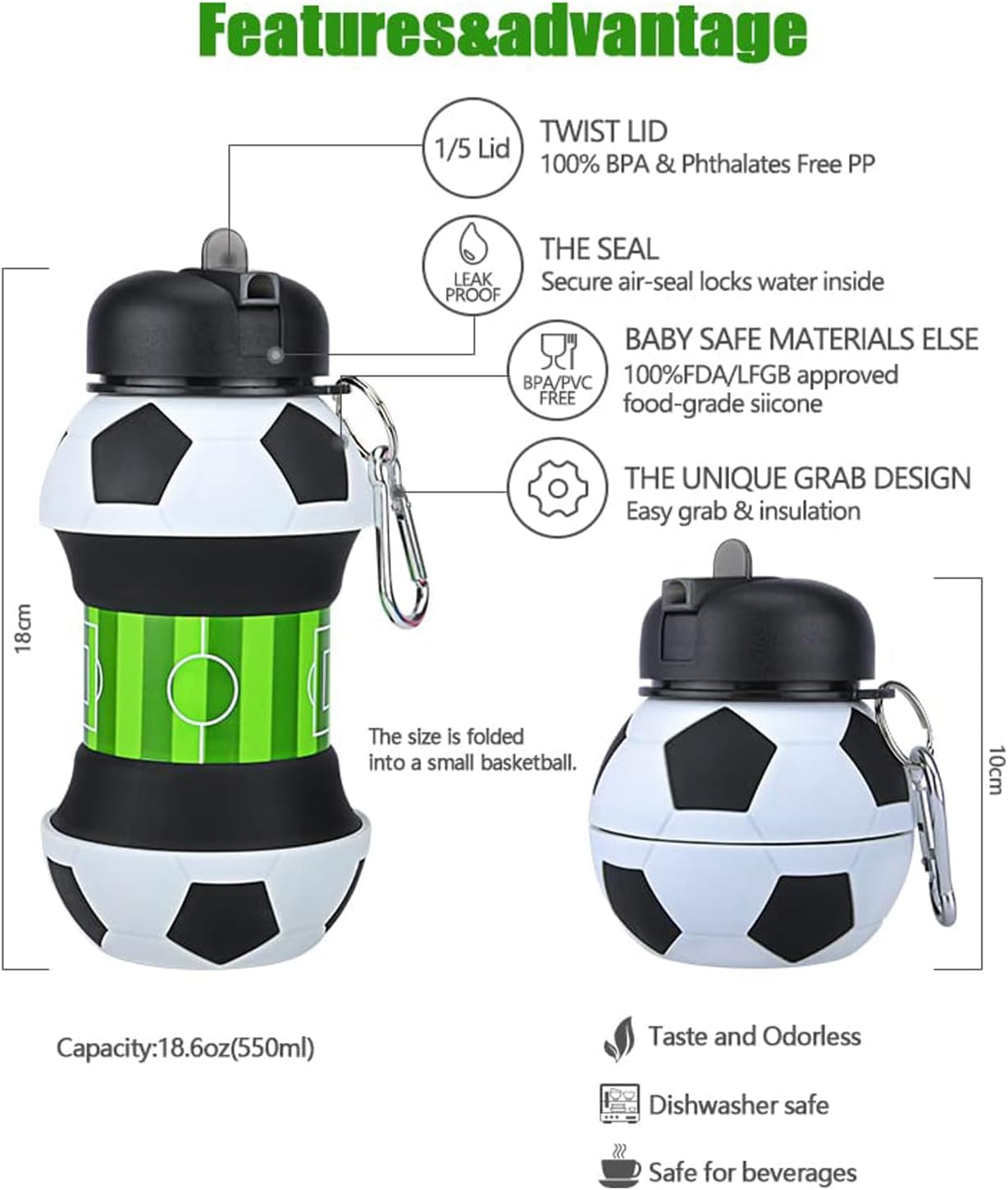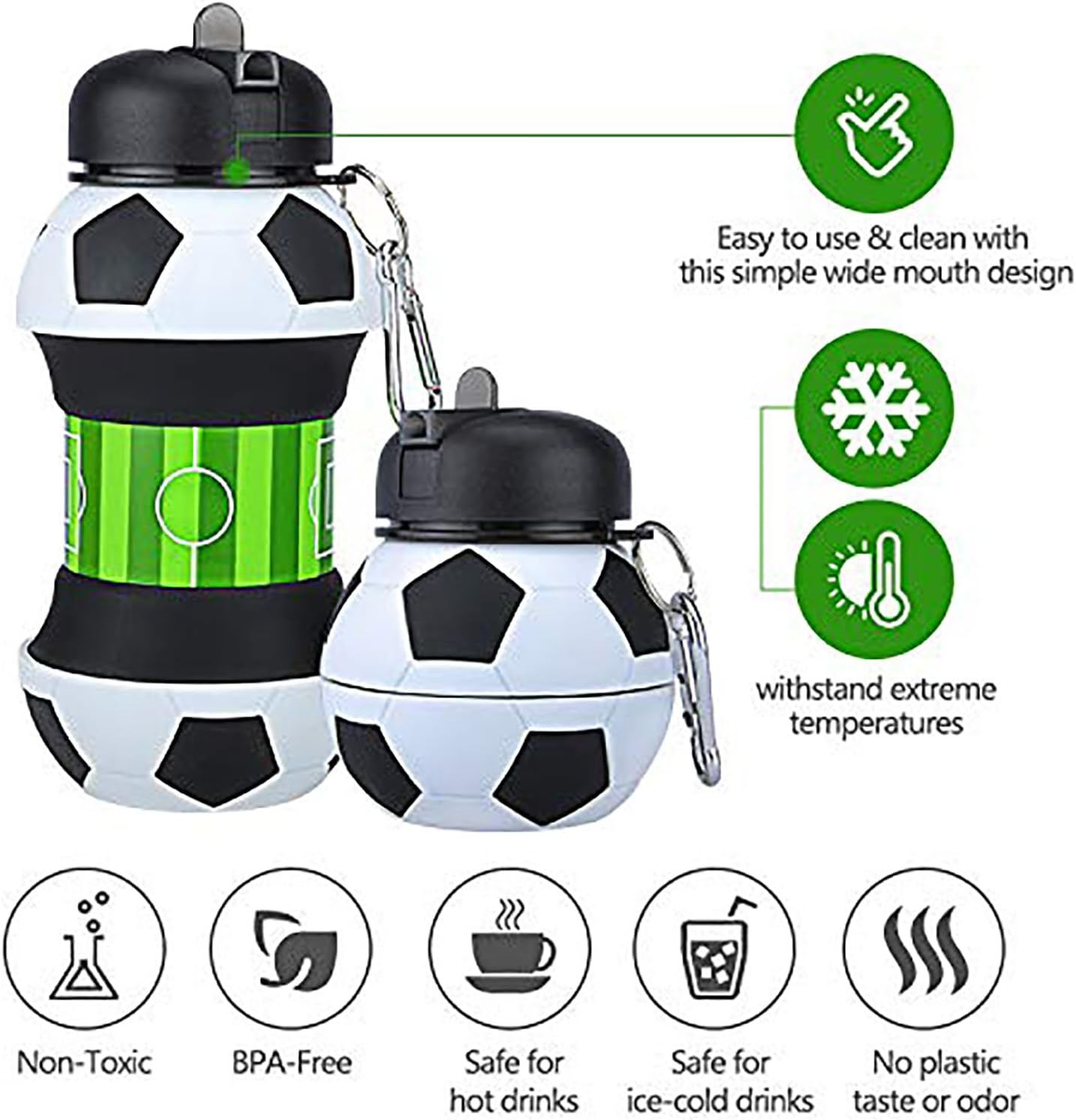 100% Food Grade Silicone Food Grade Silicone – Our -ball-shaped kids water bottle consists of BPA-free silicone that has no harsh chemicals. Includes a Carrying Clip – The secure clip at the top of the BPA-free water bottle allows you to carry it hands free. Large Capacity Water Bottle – With 18 ounces of capacity, kids will have plenty of water on hand for playing soccer, hiking or attending school. Collapsible Design – When extended, either end of the water bottle looks like half a soccer ball, and when fully collapsed, the bottle takes on a round soccer ball shape. Leak Proof Drinking Spout – Kids won’t spill the water while they’re drinking, thanks to the secure lid and the drinking spout mechanism. Product Description Soccer Water Bottle Are you tired of reminding your child to drink more water? Are their water bottles coming back from school or practice hardly drunk? Anyone with children knows that getting kids to drink more is a challenge. They forget or just don't want to. And because you get much further with motivation than with rules, we have developed a bottle that makes regular drinking child's play! Our free-flowing design makes it easy to drink from, just flip the spout up and tip or gently squeeze, no fiddly straws and ideal for teeth and jaw development in young children. It only takes 2-4 refills of our Drinking Bottle for your child to meet their recommended daily water intake. Our Soccer Water Bottle for Kids has been tried by our kids and carefully selected with parents in mind, making keeping children hydrated easy and fun! Silicone Collapsible Water Bottle Foldable & Space Save:The large-capacity water bottle can reserve 550ml liquid, Light weight, approx. 160g. Compact size before folding: 550ml; After folding: 200ml. The silicone water bottles can be folded from 7inch to 4inch. Collapsible and lightweight design allow you to save much space, portable and easier storage. 100% Leak-Proof & BPA Free Silicone: The kids water bottles is made from non-toxic materials and BPA free food grade silicone, has no taste or smell and can be used for both hot and cold drinks. Child water bottle bottle has a leak-proof cap, Wide-mouth opening is easy to fill with ice and water. Reusable & Durable: The collapsible water bottle won't fade with use. It is collapsible, soft, unbreakable and dishwasher safe.Your child can easily walk around while exploring the outdoors without spilling their drink. Portable Keychain: The foldable water bottle has a metal keyring and is easy to carry or hang on your child's backpack. The child can also easily fold it up and put the leakproof water bottle in their backpack. Wide Application: The kids sports water bottle is good for taking your water with you at school, picnic, games, hike, cruise or gym. When fully folded, the drinking cup takes the shape of a round football and it makes an ideal gift for children on birthdays, Children's Day Resuable and Resistant Strong and Flexible The durable premium food-grade silicone material of our drinking cup for kids won’t crack, break or shatter. Our bottles are designed to last longer than any plastic water bottle reducing daily plastic waste! Carabiner clip, portable, clip on, school Drink Clip and Go Our unique water bottles are fully collapsible, can hold 200ml of water when compressed and come with a handy carabiner clip making them easy to hang from any bag! Our sporty and fun collapsible Football Water Bottle convinces with its well-thought-out and unique design and is sure to encourage your kids to drink more and become their best friend, helping them achieve a happy, active and healthy lifestyle. Product Features Food Grade Silicone Material Washable - BPA FREE LEAKPROOF Portable Easy to suck With Carabiner Easy to fold Strong, flexible, collapsible cup, durable, lasts, kid friendly, water bottles for kids boys With your Kids as They Grow: Are you tired of replacing your kids' drinking bottles after a few uses? Our collapsible water bottle is made with the highest grade silicone and is sure to withstand the roughest of play. Kick, throw, hit and roll; this bottle can take it all. The Perfect Boredom Buster: Looking for the perfect football gift for boys and girls to bust any boredom. No more nagging or stress, With our fun and funky kids bottle, your kid will fall in love with drinking water. Drink, shrink, kick, repeat Ready to Explore: Say goodbye to wet and soggy bags with our leakproof kids' water bottle! Our water bottle's innovative collapsible sports design can go from 550ml to 200ml quickly, saving space and ensuring that your child is always hydrated. Safe for You and Your Kids: Your child's health is our highest priority! Our kids' drinks bottle is certified BPA FREE, durable, 100% leak-proof and reduces daily plastic waste. Featuring a convenient Cleaning Brush to help you keep the spout in tip-top condition.