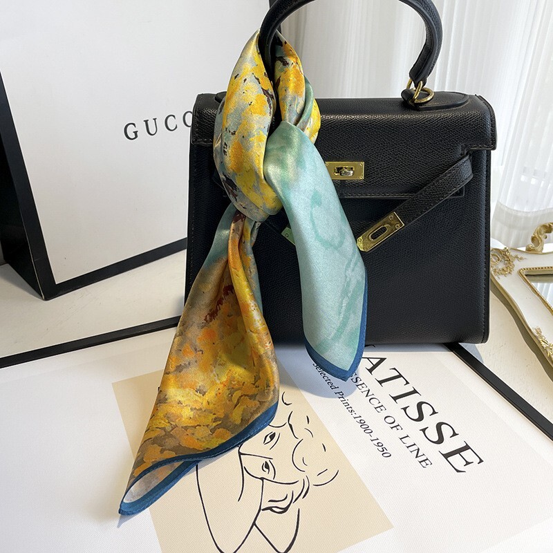 100% Pure Silk 21 Inch Blue Yellow Floral Scarf Bandana Wrap for Women
