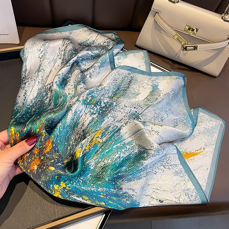 100% Silk Scarf Women Beige Green Flower Head Bandana Small Kerchief Turban 53cm
