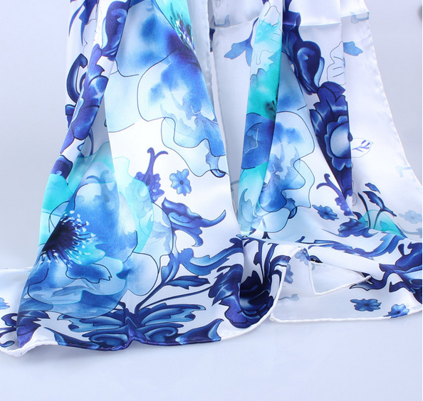Sallys Blue 100% Satin Silk Scarf with Floral Print 21 Inch Square Hairband