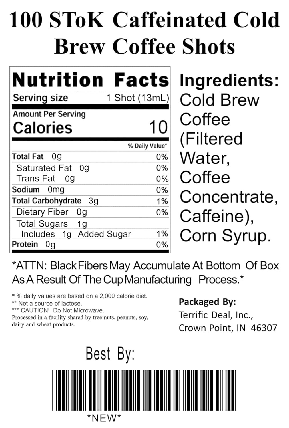 100 SToK Caffeinated Unsweetened Black Coffee Shots. 100 Fl Oz (Pack of 1) Product Details Is Discontinued By Manufacturer : No Manufacturer : STOK Units : 100 Fluid Ounces Brand: STOK Item Form: Liquid Flavor: Espresso,Unsweetened Caffeine Content Description: Caffeinated Roast Level: Dark Roast 100 SToK Espresso Coffee Shots 100 Bulk Single Serve Cups, packaged in non-manufacturer 8"x6"x6" corrugated box for safe shipping Each 13 ml serving delivers 40 mg of caffeine No refrigeration needed. ATTN: Black fibers may accumulate at bottom of box as a result of the cup manufacturing process. STOK Caffeinated Cold Brew Coffee Shots delivers 40 Mg of caffeine per serving, which is equivalent to a shot of espresso. It’s a 13 mL Black Coffee Shot that puts more caffeine in your coffee. Comes in a creamer-like container for portion control. Limit to 2 servings per day. Not for use by children under age 18, pregnant women or the caffeine-sensitive. This is the ideal convenience pack. Buy these 100 shots and use them with up to 2 cups of coffee a day. Amazingly enough, these are delicious in some beers. Actual product packaging and materials may vary.