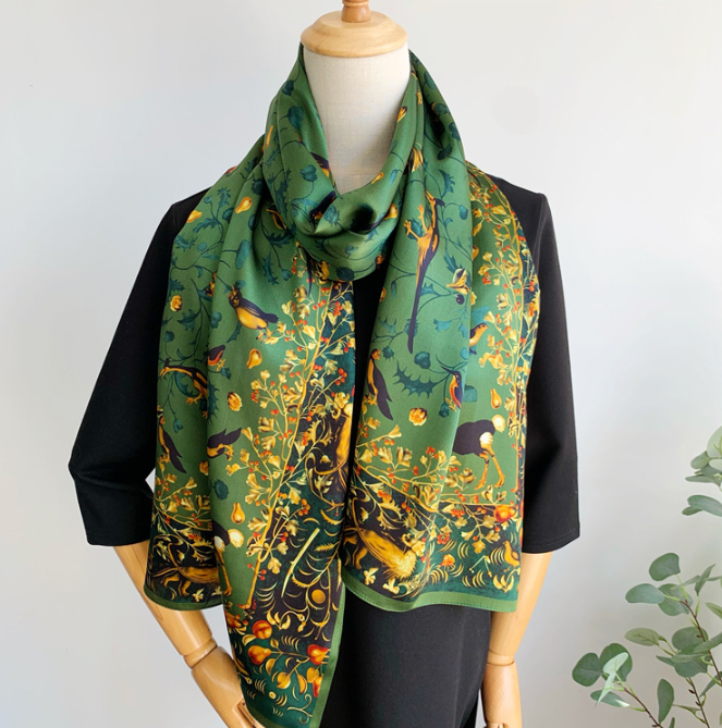 Cute easy-to-wear scarf that works in any weather. The twill weave is looser, so it breathes a bit more. Packaged well, arrived quickly. I like this seller.