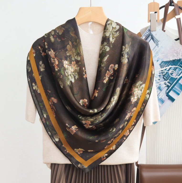 I love my gorgeous silk scarf which is more beautiful than the picture!! Exactly what I wanted and looks perfect with my sweater! I was amazed by how quickly it arrived— I got an excellent price on the scarf and on shipping, too! I will definitely keep this seller!! THANK YOU SO MUCH!!