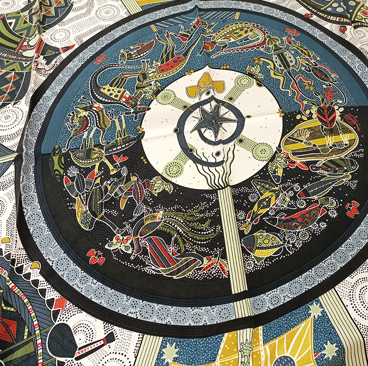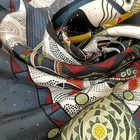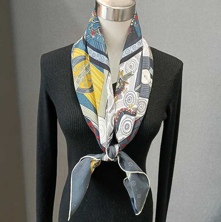 Such an interesting, elegant scarf. So many colors and details, all without being overwhelming. Perfect for an outfit with black basics. High quality twill with a wonderful, soft feel. Packaged well, good price, arrived quickly for overseas. Excellent seller.