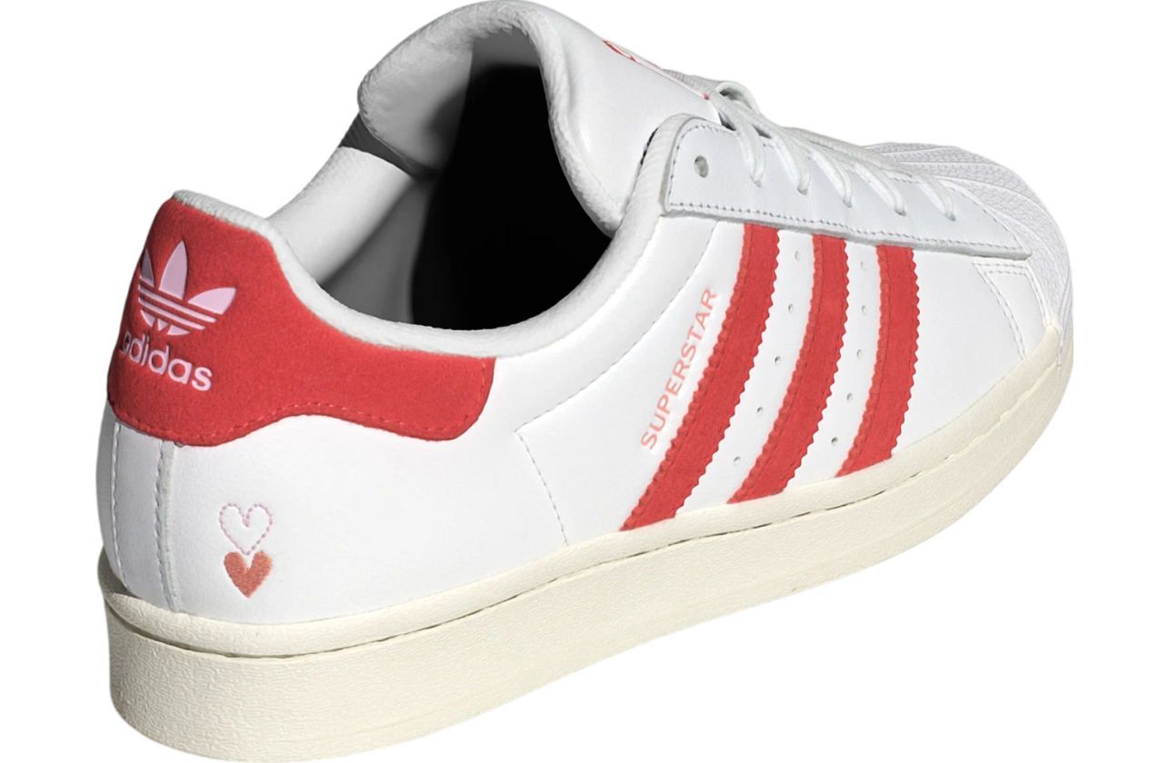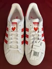 $100.00 MSRP NOTE: Shoes and brand new, pristine, and have never been worn. Box is beat up. The adidas Women’s Superstar ‘Valentine’s Day 2024’ dresses the classic silhouette in a holiday-themed palette in honor of February 14. Crafted from white leather with a tonal rubber shell toe, the upper features red suede detailing on the signature three-stripes and Trefoil-branded back tab. A pair of hearts are embroidered on the lateral heel, while an additional heart graphic adorns the adidas tongue tag. A vintage off-white finish is applied to a rubber cupsole, featuring a herringbone traction pattern underfoot. Details & care Serrated 3-Stripes and a textured clamshell toe bring iconic detailing to a sneaker that's been a footwear favorite since it hit the streets in 1969. Its low, lace-to-toe profile and herringbone tread keep the heritage vibes alive and on the move. Lace-up style Leather and synthetic upper/textile lining/rubber sole Imported PRODUCT INFORMATION Model: IG5958 Release Date: 2024-01-01 Series: Superstar Nickname: Valentine's Day Thickness: Regular sole Upper Material: Leather Closure: Lacing Sole Material: Rubber Sole Upper: Low Top Toe Type: Round Toe Occasion: lifestyle Color: white Colorway: Cloud White/Bright Red/Wonder Clay