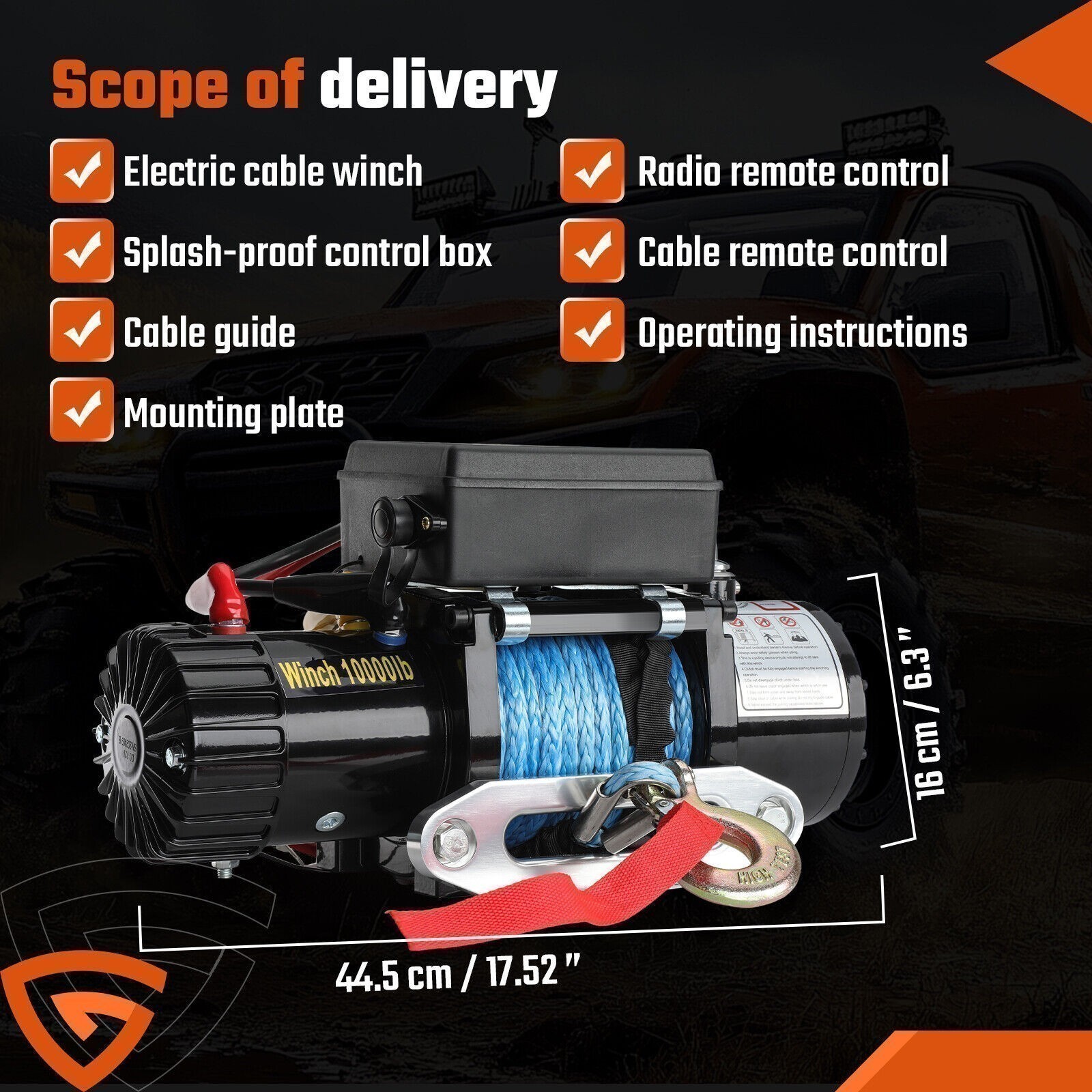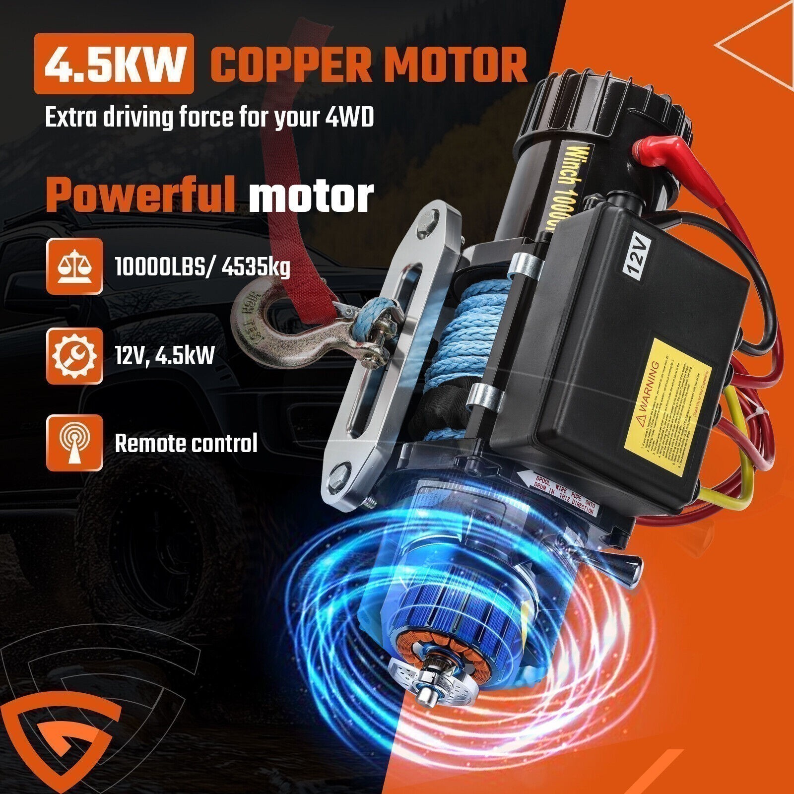Item Specifications Performance Voltage DC 12V Rated line pull(single line) 10000LB(4535KG) Motor 6HP(4.5KW)Series Wound Gear train 3 Stage Planetary Gear reduction ratio 265:1 Free Spooling Clutch Sliding ring gear Wire Rope Ø9.5mm ×26m Drum Diameter/Length Ø64mm x224mm Braking action Automatic in the drum Fairlead Aluminum Fairlead Duty Cycle Intermittent Mounting bolt pattern 114mm*254mm Remote Control Cable 25m-30m Box Included: 1 x 10,000lb Winch 1 x Synthetic Rope 1 x Wireless Remote Control 1 x Hand Remote Control 1 x Solenoid Box Assembly 1 x Aluminum Fairlead 1 x Negative Wire 1 x Hook 1 x Users Manual Mounting Screws are Included