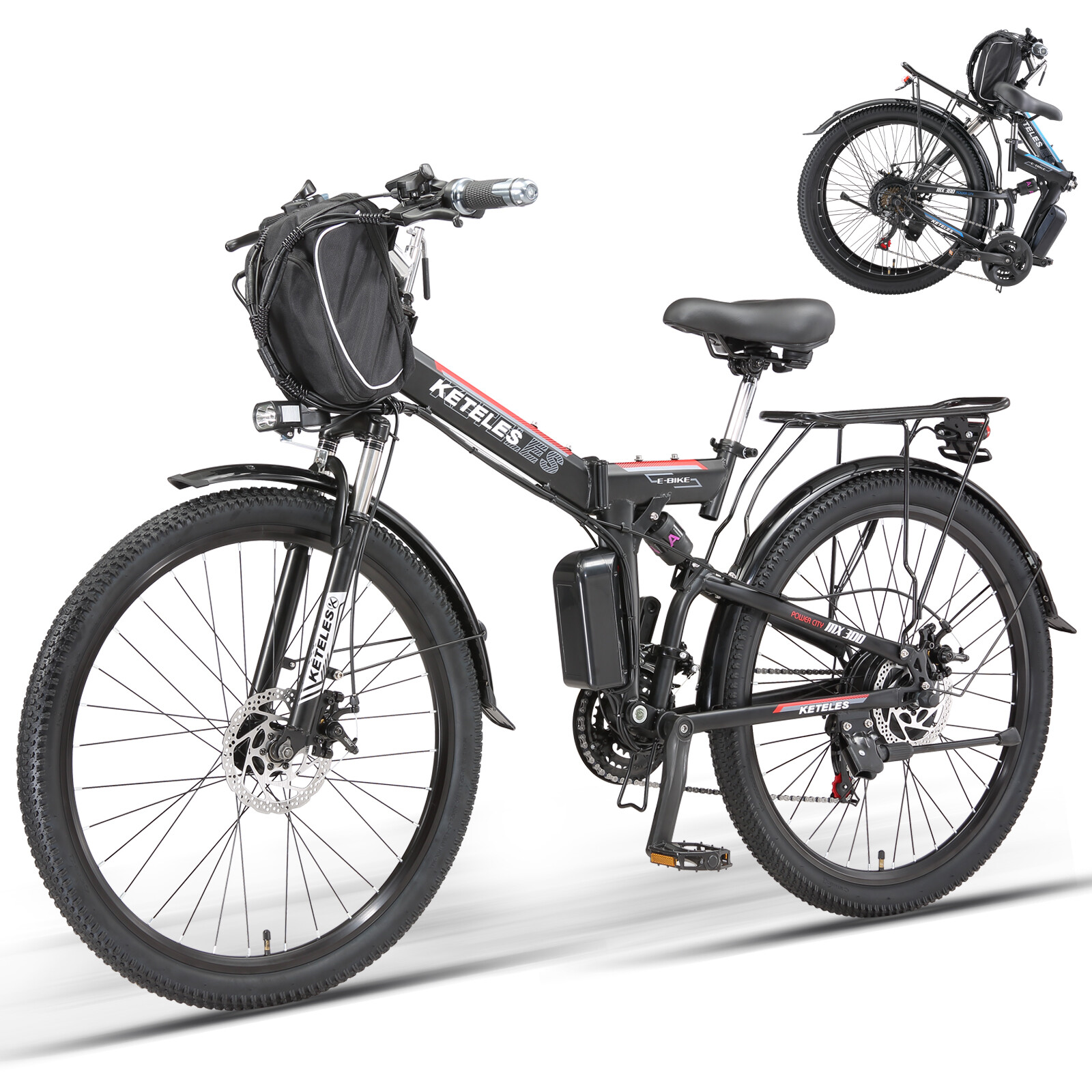 1000W Electric Bicycle KETELES 26" folding Mountain Bike 48V/20Ah for Adults US About this item: *【1000W POWERFUL MOTOR & REMOVABLE BATTERY】 ---Cityscape Electric Bike is equipped with a 1000W brushless motor, provide enough power for your daily outings.Up to 22mph Top Speed. 48V 960WH large removable battery is strong enough for these activities. The ebike can ride 50 miles by pedal assist after charging 4~5 hours, long battery life.And BMS protection in an IPX4 waterproof casing, mileage anxiety is a thing of the past. Embrace every journey with confidence. *【3 WORKING MODES】 --- KETELES Electric Bike is a powerful and cost-effective folding e-bike. 1. Pedal Assist Mode 2. Fully Electric Mode 3. Pedal Mode. Three riding modes switch easily for enjoying a long time travel, and also exercise. * 【 21-SPEEDS GEAR FLEXIBILITY】 --- This KETELES folding ebike has 21-speed gears. Seamlessly adapt to any terrain, from the bustling city streets to the rugged mountain trails. Embrace the freedom to explore and unleash your inner thrill-seeker. * 【COMFORT MEETS STYLE & RICH CONFIGURATION】 ---KETELES Electric Bike made of high-strength carbon steel frame and superior bike paint. Ergonomic and stylish step-thru design, enlarged comfortable seat.LED Headlights and tail light for safe riding.Please note every new bike has gone through road testing before packing, there may be some dust on the tires. * 【HASSLE-FREE SETUP & STELLAR SUPPORT 】 --- Jumpstart your biking adventure with KETELES's 90% pre-assembled e-bike. We stand by our commitment to quality and your satisfaction with a one-year warranty and dedicated 24-hour customer service. Any questions or needs? Reach out, and we'll ensure your KETELES experience is nothing short of exceptional. Specification: Bike Type E-Folding Bike Age Range Adult Brand KETELES Number of Speeds 21 Color Black-Blue/Black-Green/Black-Red Wheel Size 26 Inches Brake Style Disc Brake Mechanical Brake with Power Cut-off Feature Throttle Twist Throttle on the Right side of Handlebar Display Smart LCD display that shows speed, battery status, pedal assist level, etc. Range Fully Electric Mode Range: around 30~40km Pedal Assist Mode Range: around 50~60km Voltage 48 Volts (DC) Model Name MX300 Wattage 1000 watts Item Weight 26kg Maximum Weight Recommendation 330LBS Warranty 1 year Suggested Users Unisex-adult Charge time 4-5 hours Warm Tip ! 1.Please install the bicycle according to the instructions after receiving it. If you encounter any problems during installation, please feel free to contact us. If necessary, we can also send you installation demonstration videos to help you reduce the problems encountered during installation. 2.New electric bike passes road test before packing, therefore dust on the tires is inevitable. 3.Upon arrival, mark down the serial number, which locates on the middle axle tube, and register to vehicle management center. It is necessary to track your ebike while preventing loss. 4.Please be aware of the height of electric bike. Package Included: *1 x Electric bicycle * 1 x Headlight *2 x Fenders *1 x Charger *1 x Battery *1 x Tool kit *8 x Tools *2 x Pedals *1 x Taillight *1 x Rear rack *1 x Air cylinder *1 x Lock Note: Our products have been certified under UL2849 safety standards. Payment Delivery details Terms of sales About us Contact us Payment We accept Credit Card, Debit Card and eCheck payments through Payoneer. Delivery details 1. Thank you very much for purchasing our products. 2. All the items double checked well packed bafore shipping. 3. Itme will be dispatchec within 2 business day(not includes the holiday and weekend) after your payment. 4. We usually use Fedex or UPs logistics to transport your package, and the delivery time would be about 5-7 business days. 5. When you have completed your payment, please leave your correct phone number and address, you could contact us by courier for any quesiton. And keep your phone open, prevent the delivery staff contacting you and causing the package to be returned. Terms of sales We guarantee 100% customer satisfaction. We check all items before sending out, if you received an broken/ defective item, please take photos and send to us immediately. We only accept those case reported within 30 days. Please keep all package material, return items must be in good condition. About us Keteles was specialized in producing bicycle, mountain bike, electric bikes, folding bikes, and other bicycle products. Our products are characterized by elegant appearance, superior quality, assorted specification, novel design, safety and reliability. With a complete set of facility, a perfect quality insurance system and an advanced testing method, we have experienced designers, engineers, management personnel and workers. We always stress on product quality and new product development. We strictly stick to tenet of "emphasizing on quality, stressing on credit, seeking for little profit and pursuing for development". We have gained a good reputation among customers at home and abroad. With our strict quality management, reliable credit, powerful strength and comprehensive marketing network, we sincerely welcome customers to cooperate with us. We would like to accompany you to create a brilliant future. Contact us Our goal is to make sure you are a happy buyer and have a pleasant shopping with us. Please leave us positive feedback and 5 stars rate if you are happy with our item and service. Please contact us before leaving any 1 or 2 ratings, neutral or negative feedback or open any dispute. We understand the concerns and frustrations you might have, and will do our endeavor to resolve the issues. Please give us the opportunity to resolve any problem. We thank you for your effort to make this sale and purchase experience a happy one! If you have any question about us, feel free to contact us, Please allow 24 hours for a message reply! We are highly appreciated your Positive feedback, we will try 