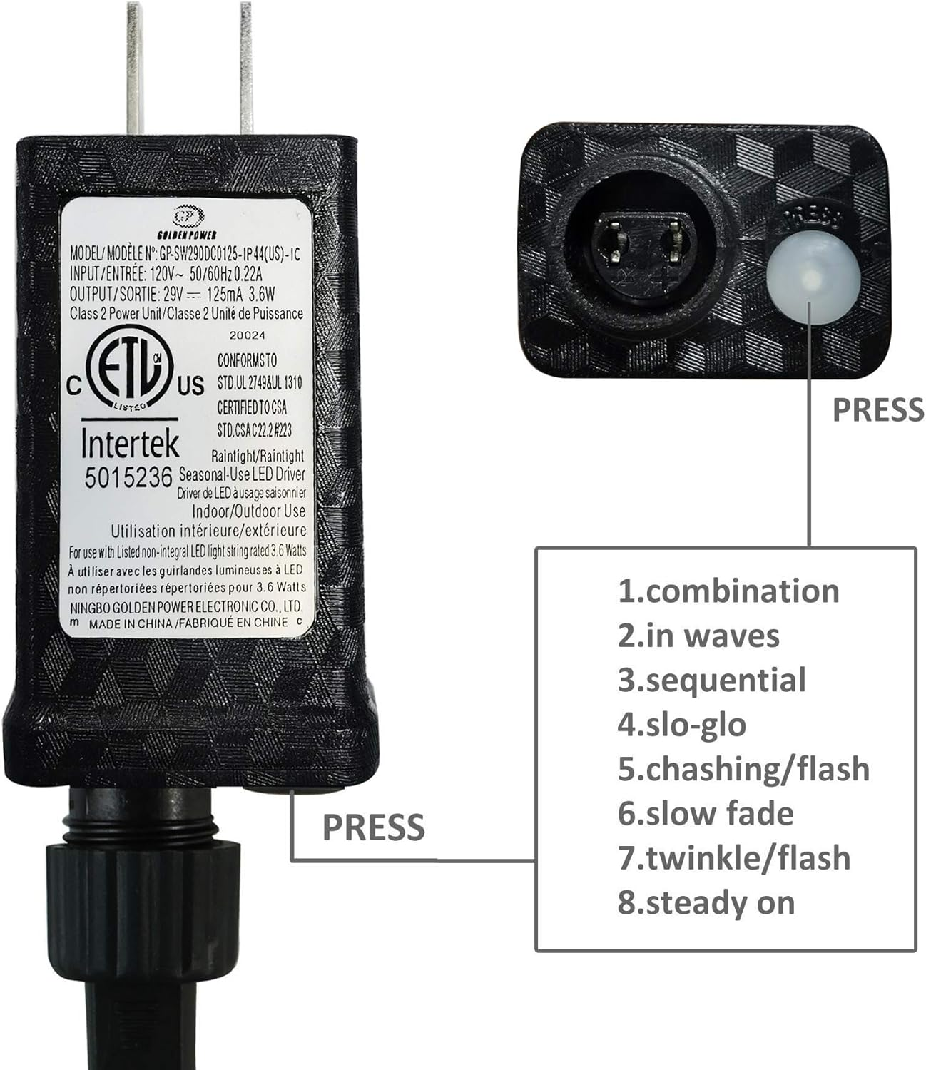 Multi-color string fairy lights on dark green cable Lighting with 8 modes to provide the perfect environment as your decorative needs. With memory function, lights will work in the mode you set last time and no need to re-set. Low voltage transformer takes the output voltage down to 30V that really safe for use at home. IP44 rainproof that makes the light string can be used outdoor Product description Introduction: Light color Mixed color (Red Yellow Blue Green) LED Bulbs 200 LEDs Cable color Dark Green Total Length 75ft (23m) String Length 65ft (20m) Lead Cable Length 9.8ft (3m) Space of LED Bulbs 0.32ft (10cm) Electronic Transformer Power 3.6W Transformer Input 120V~50/60Hz Transformer Output 29V Package: 1 x String Lights 1 x Low Voltage Transformer 1 x User's Manual 8 Lighting Effect: 1. Combination 2. In waves 3. Sequential 4. Slo-Glo 5. Chasing/Flash 6. Slow fade 7. Twinkle/Flash 8.. Steady on Memory Functon: It can remember the last setting that you choose when you turn on the power again. IP44 Rainproof: Suitable for indoor and outdoor decorations. Wonderful for garden party, wedding, birthday party and BBQ in evenings. Please Note: IP44 Rainproof: protested against water sprayed in any direction; The transformer must be indoors and protected from damp.