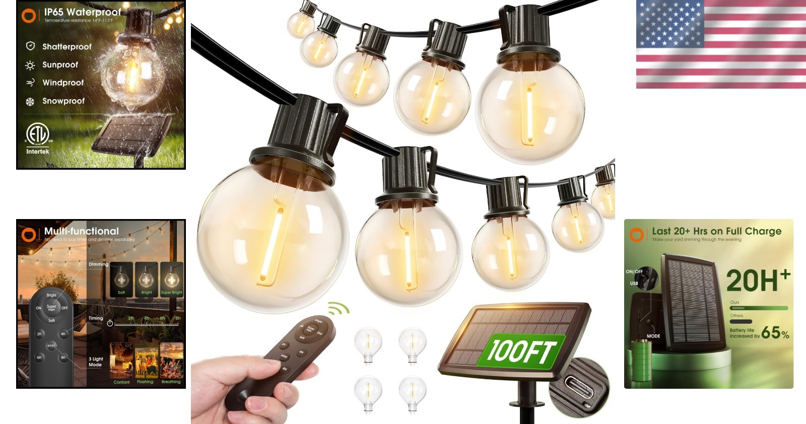 These solar string lights are a game-changer for outdoor spaces! The 100ft length is perfect for covering large areas, and the dimmable feature with remote control makes it so easy to adjust brightness. I love that they’re solar-powered—no outlets or extra bills. The timer is super convenient, and the spare bulbs are a nice touch. They create such a cozy, magical vibe at night. Highly recommend for anyone wanting hassle-free, beautiful lighting!