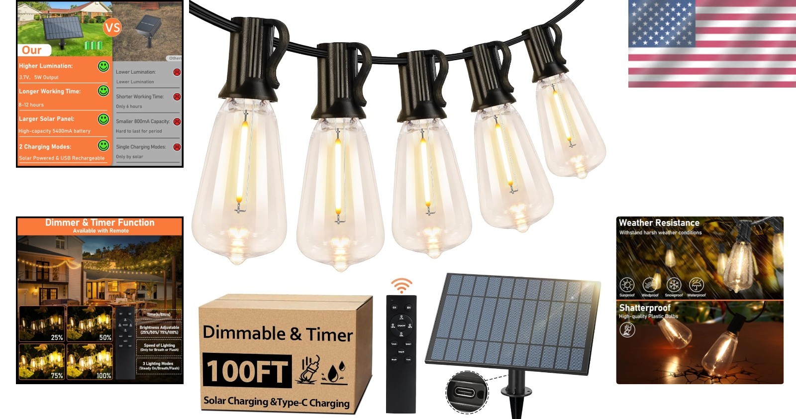 Versatile 100FT Outdoor Solar String Lights - Dimmable & Timer Features Included ‹ › ‹ › ‹ › ‹ › ‹ › ‹ › ‹ › ‹ › ‹ › Versatile 100FT Outdoor Solar String Lights - Dimmable & Timer Features Included Product Features: Solar Powered & Type-C Charging: Harness the sun’s energy during the day, with automatic night illumination. Built-in Type-C charging port ensures functionality even during cloudy weather. Waterproof & Shatterproof: Fully sealed design withstands harsh weather conditions. Made of durable, hard plastic, the shatterproof bulbs ensure a safe experience without dangerous shards. 3 Lighting Modes & 4 Level Dimmable: Choose from 4 dimming options and 3 lighting modes to create the perfect ambiance for any occasion, from romantic dinners to lively parties. Convenient Remote Control & Timer Function: Effortlessly adjust settings with a remote, including brightness, timer, and lighting modes, ensuring convenience without the hassle of manual adjustments. Easy Installation & Widely Used: Designed with cup hooks for effortless installation. Ideal for patios, backyards, decks, cafes, pergolas, and gardens — your outdoor space will come alive! Why Choose Our Solar String Lights? Transform your outdoor spaces into a mesmerizing wonderland with our Versatile 100FT Outdoor Solar String Lights. These lights aren't just a source of illumination; they create an enchanting atmosphere for every gathering. With exceptional features like dual charging options and adaptable lighting modes, these string lights are designed to cater to your needs in any setting. Whether you want to unwind with warm, soft lighting or throw a lively party, these lights will effortlessly elevate every occasion. Invest in long-lasting, eco-friendly outdoor lighting that combines beauty and functionality. Prepare to impress your guests and elevate your ambiance with stunning brilliance. Don't miss out on your chance to enhance your indoor and outdoor environments. Order your Versatile 100FT Outdoor Solar String Lights today and let the magic begin! Shipping Free & Fast Shipping - We offer free shipping to most of the USA with a normal delivery time of 3-10 businessdays. However, due to various situations, additional delivery time (up to 3 weeks) may be required for some items. Alternative Carriers - We may use alternative carriers (e.g. USPS, FedEx, UPS, etc.) to ensure your package arrives safely and on time. Due to the use of multiple carriers, we are unable to provide a tracking number automatically. Handling Time - Orders are processed and shipped within 1-5 business days of receiving cleared payment. Shipping Restrictions - Shipping to Alaska, Hawaii, Puerto Rico, Guam, and other US territories may incur shipping charges or delivery restrictions. Please contact us before ordering, or your order can be refunded/cancelled. State Restrictions - There may be restrictions based on your state of purchase. For example, certain items may not be shipped to California due to state regulations. Contact for Tracking Updates - If you require tracking updates or have any concerns about the delivery of your order, please feel free to contact us, and we will be happy to assist you. Return Please see our ebay return policy. We do not accept return on most products. This is to avoid customers mis-using ebay returns. All sales are final. Please be sure to check the return policy listed at the top of the listing. In rare cases, we may accept returns, if the buyer pays both ways shipping and 20% restocking fee. If you are un-sure of return policy of a particular item, please ask before buying. Payment We accept all major credit cards, PayPal, and Apple Pay for your convenience. Your payment information is secure and encrypted to ensure a safe and seamless transaction. Please complete your payment within 3 days of purchase to avoid any delays in shipping. Feedback Your feedback is extremely important to us. We strive to provide the best products and customer service possible. If you are satisfied with your purchase, please take a moment to leave us a positive review. If you have any concerns or issues with your order, please contact us before leaving negative feedback. We are committed to resolving any problems and ensuring your satisfaction. Contact Us If you have any questions or concerns, please feel free to reach out to our customer support team. You can contact us through the eBay messaging system. We are available Monday to Friday, 9:00 am to 5:00 pm EST, and we will do our best to respond to your inquiry within 24 hours. Buy it now and enjoy a pleasant shopping experience! UPC: Not Set Size: 100ft Lumens: Not specified Item Height: Not Set Power Consumption: 5W Unit Quantity: 1 Features: Dimmable,Waterproof,With Remote Control,Timer,3 Lighting Modes,Shatterproof,Energy Efficient Light Color: Warm White Occasion: Christmas,Congratulations,Halloween,Wedding,Wedding & Engagement Control Style: Remote Control Department: Unisex Baby & Toddler,Kids,Teens,Adults,Unisex Theme: Christmas Room: Patio,Backyard,Deck,Bistro,Cafe,Garden Material: Plastic Character: Not Set Labels & Certifications: Not Set Brand: Unbranded Type: Rope/Wire Lighting Technology: LED Light Shape: AR70 Sensor Type: Not specified Installation Area: Outdoor Color: Black Power Source: Solar Cord Color: Black Number of Settings: 2 LED String/Strip Type: Not specified Energy Star: Not Set MPN: Not Set EC Range: Not Set LED Chip Code: Not specified Voltage: Not specified Output Voltage: Not specified IP Rating: Waterproof Character Family: Not Set Amperage: Not specified Manufacturer: Not Set Style: Modern Country/Region of Manufacture: Not Set Number of Lights: 50 Color Temperature: 2700 Kelvin Bulb Life Hours: Not specified Model: Not Set Unit Type: Unit