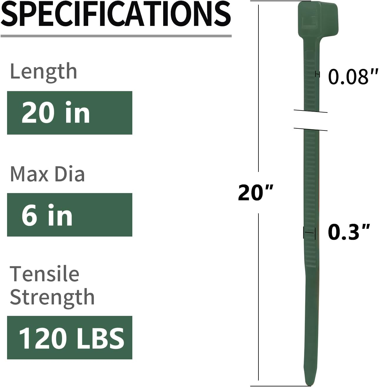 【Package Detail】The package includes black heavy duty zip ties 20inch/500mm .Cable ties width: 0.3inch/7.6mm Total Quantity: 100 pcs 【120LBS Tensile Strength】Zip Ties with 120 lbs are 0.3 inches / 7.6mm, zip-ties offer maximum flexibility and durability, making them perfect for a wide range of applications, from organizing cables to securing objects. 【High Quality】 Upgrade MasiStranth cable tie is made of industrial strength PA-66 nylon, durable, weatherproof, Soft and Strong with 120Lbs Tensile Strength, and can be used in temperatures ranges from -35℃ to 85℃ 【Self-Locking Desgin】Self-Locking Zip Ties adopt humanized anti-return design, the tooth grooves are alternately overlapped to reach the locking position, and the teeth are not returned while fixing the self-locking, which can better fix the thing. 【Multiple uses】With various applications for organizing cables, Securing a bike, Gardening, Replacing broken straps, popular with decorators, designers and engineers, recommended for outdoor or indoor use Upgrade MasiStranth cable tie is made of industrial strength PA-66 nylon, durable, weatherproof, Soft and Strong with 120Lbs Tensile Strength, and can be used in temperatures ranges from -35℃ to 85℃
