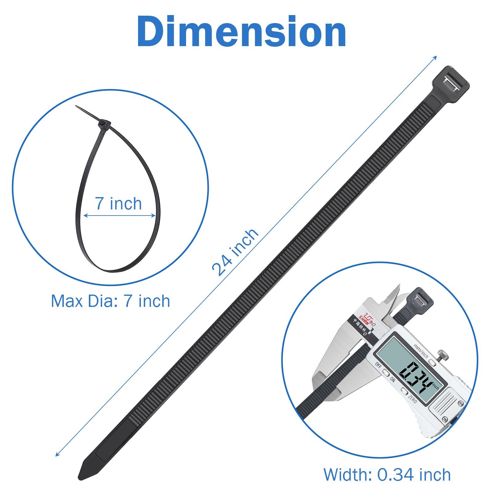 Large Zip Ties Heavy Duty 24 inch Cable Ties 100 Pack Black Wire Ties Reusable UV Resistant Black Zip Ties 200lbs for Indoor and Outdoor use About the Product Key Features Versatile Sizes & Strength:Tackle any project with ease using these high-quality zip ties - Whether you're organizing cables, securing garden plants, or DIY-ing in the home, these 24-inch 200-pound tensile strength cable ties measuring 0.35 inches wide and 0.059 inches thick will meet your needs. Self-Locking Design:Stay worry-free with the self-locking design of these versatile zip ties heavy duty - No need for extra tools or clips, simply secure cables or bundle items with a simple pull and lock mechanism for hassle-free handling. High Temperature Resistance:Experience peace of mind knowing these zip ties heavy duty outdoor offer high temperature resistance - From outdoor garden projects to indoor electrical cable management, these large zip ties maintain their integrity even in varying weather conditions. Multi-Purpose Applications:Achieve the perfect fit with the adjustable max bundle diameter of 7.5 inches - Customize the size of your cable bundles or secured items easily with these flexible black zip ties suitable for a range of applications around your home or garden. Premium Quality & Value:Invest in a multipurpose solution for your projects with this pack of 100 long zip ties - From organizing your garage to bundling camping gear, these durable and reliable heavy duty zip ties for outdoor use are a must-have for any DIY enthusiast or professional. Delivery Information Our shipping is prompt and secure. Orders are dispatched within 1-2 business days. It should take 3-5 business days for the product to reach your destination (Saturday and Sunday excluded). We do not ship to a different address. we will ship to the address you provide on the ebay only. Please check your address before purchase. Return Policy Returns are accepted within 30 days if you are not completely satisfied. Refunds are issued back to your original payment method. Items must be returned in their original condition and packaging. Payment Options We accept PayPal, credit cards, and other payment methods supported by eBay. Please ensure your payment details are up-to-date to avoid any delays. Your Feedback Matters We appreciate your feedback. If you're happy with your purchase, please consider leaving a positive review. Contact Information If you have any queries or require further assistance, please contact us via eBay messages.