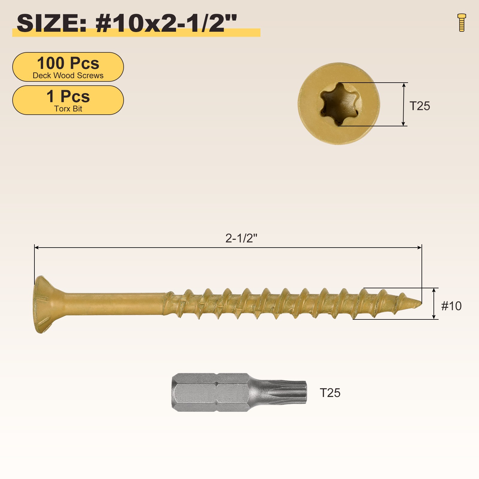 Document APPLY TO - This versatile deck screw is suitable for a wide array of wooden applications, including but not limited to patios, fences, frames, farm structures, ladders, outdoor furniture, pet houses, doors, tables, chairs, shelves, and workbenches. SPECIFICATION:Screw Size: #10x2-1/2"(Thread Dia x Length)Tail Type: Type 17Slot number: T25Color: TanMaterial: Carbon SteelQUANTITY INCLUDED - 100Pcs x Deck Wood Screws; 1Pcs Torx BitADVANTAGE - Constructed from carbon steel with an advanced anti-corrosion treatment, these screws exhibit superior resistance to rust and corrosion. They have been tested for 1000 hours under salt spray conditions, ensuring reliable performance in both extreme heat and cold. This makes them highly durable and long-term use in various environments.DESIGN - The star drive design ensures a secure grip, minimizing the risk of slippage during installation and removal. The fine-point 17-gauge tip allows for effortless penetration into different types of wood, including hardwoods, softwoods, and pressure-treated materials. Additionally, the coarse serrated threads provide a robust hold, reducing board separation and enhancing overall structural stability.Note - Before purchasing, it's recommended to use a caliper to verify the correct size for precise measurements, as rulers or tape measures might not be accurate enough. Deck Screws(#10x2-1/2") 100Pcs,Carbon Steel Wood Screw with T25 Torx Drive,Tan APPLY TO - This versatile deck screw is suitable for a wide array of wooden applications, including but not limited to patios, fences, frames, farm structures, ladders, outdoor furniture, pet houses, doors, tables, chairs, shelves, and workbenches. SPECIFICATION: Screw Size: #10x2-1/2"(Thread Dia x Length) Tail Type: Type 17 Slot number: T25 Color: Tan Material: Carbon Steel QUANTITY INCLUDED - 100Pcs x Deck Wood Screws; 1Pcs Torx Bit ADVANTAGE - Constructed from carbon steel with an advanced anti-corrosion treatment, these screws exhibit superior resistance to rust and corrosion. They have been tested for 1000 hours under salt spray conditions, ensuring reliable performance in both extreme heat and cold. This makes them highly durable and long-term use in various environments. DESIGN - The star drive design ensures a secure grip, minimizing the risk of slippage during installation and removal. The fine-point 17-gauge tip allows for effortless penetration into different types of wood, including hardwoods, softwoods, and pressure-treated materials. Additionally, the coarse serrated threads provide a robust hold, reducing board separation and enhancing overall structural stability. Note - Before purchasing, it's recommended to use a caliper to verify the correct size for precise measurements, as rulers or tape measures might not be accurate enough. Hot Item Payment 1.We accept eBay payment . 2.Payment must be received within 7 business days of auction closing. Shipping 1.We ship to your eBay or Paypal address. Please make sure your eBay and Paypal address is correct before you pay. 2.Items will be shipped within 1-3 business day when we received payment. 3.Delivery time depends on destination and other factors. Description Policy Deck Screws(#10x2-1/2") 100Pcs,Carbon Steel Wood Screw with T25 Torx Drive,Tan APPLY TO - This versatile deck screw is suitable for a wide array of wooden applications, including but not limited to patios, fences, frames, farm structures, ladders, outdoor furniture, pet houses, doors, tables, chairs, shelves, and workbenches. SPECIFICATION: Screw Size: #10x2-1/2"(Thread Dia x Length) Tail Type: Type 17 Slot number: T25 Color: Tan Material: Carbon Steel QUANTITY INCLUDED - 100Pcs x Deck Wood Screws; 1Pcs Torx Bit ADVANTAGE - Constructed from carbon steel with an advanced anti-corrosion treatment, these screws exhibit superior resistance to rust and corrosion. They have been tested for 1000 hours under salt spray conditions, ensuring reliable performance in both extreme heat and cold. This makes them highly durable and long-term use in various environments. DESIGN - The star drive design ensures a secure grip, minimizing the risk of slippage during installation and removal. The fine-point 17-gauge tip allows for effortless penetration into different types of wood, including hardwoods, softwoods, and pressure-treated materials. Additionally, the coarse serrated threads provide a robust hold, reducing board separation and enhancing overall structural stability. Note - Before purchasing, it's recommended to use a caliper to verify the correct size for precise measurements, as rulers or tape measures might not be accurate enough. Hot Item Payment 1.We accept eBay payment . 2.Payment must be received within 7 business days of auction closing. Shipping 1.We ship to your eBay or Paypal address. Please make sure your eBay and Paypal address is correct before you pay. 2.Items will be shipped within 1-3 business day when we received payment. 3.Delivery time depends on destination and other factors.