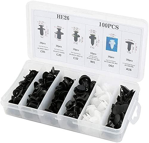 These clips fasteners are made of nylon material suitable for car use durable and long service life. Cars good accessory, commonly used for fitting side skirts, bumpers and other trim. Push Type Retainer Kit came with a nice plastic box for easier to pick a type of retainer that you want to use. Need not worry about lost or damaged body fasteners.All the necessary retainers for exact replacement of old and broken retainers. Note: All vehicles have a range of different clips used on them. Different models have different sizes and there are no universal clips. Please check as much as possible before buying. Package including 100pcs Clips + 1 Plastic Box