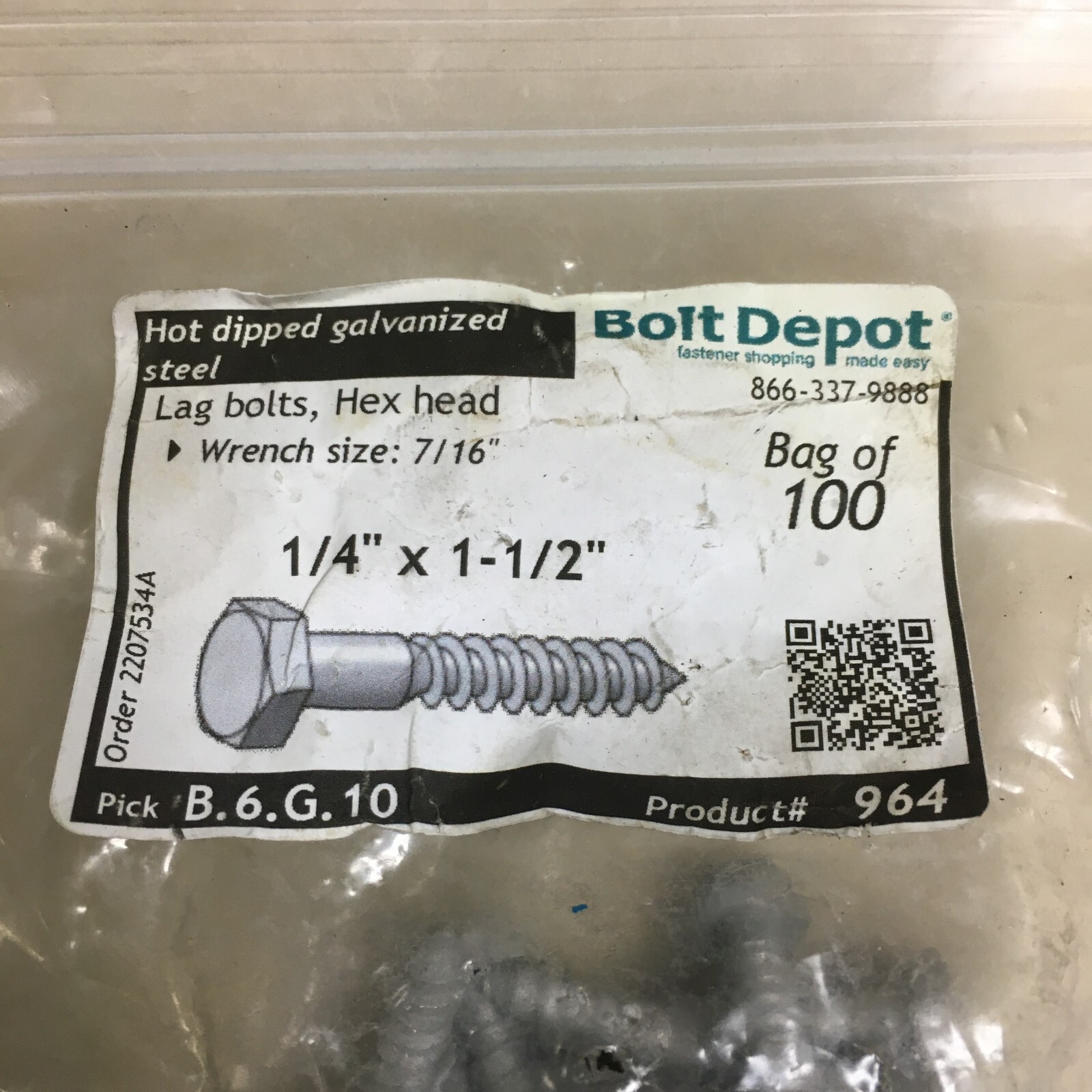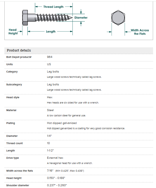 Number in Pack:100Brand:Bolt DepotScrew Size:1/4"Item Length:1-1/2 inHead Style:Hex HeadSystem of Measurement:InchFinish:GalvanizedMPN:964Type:Lag BoltsMaterial:Steel