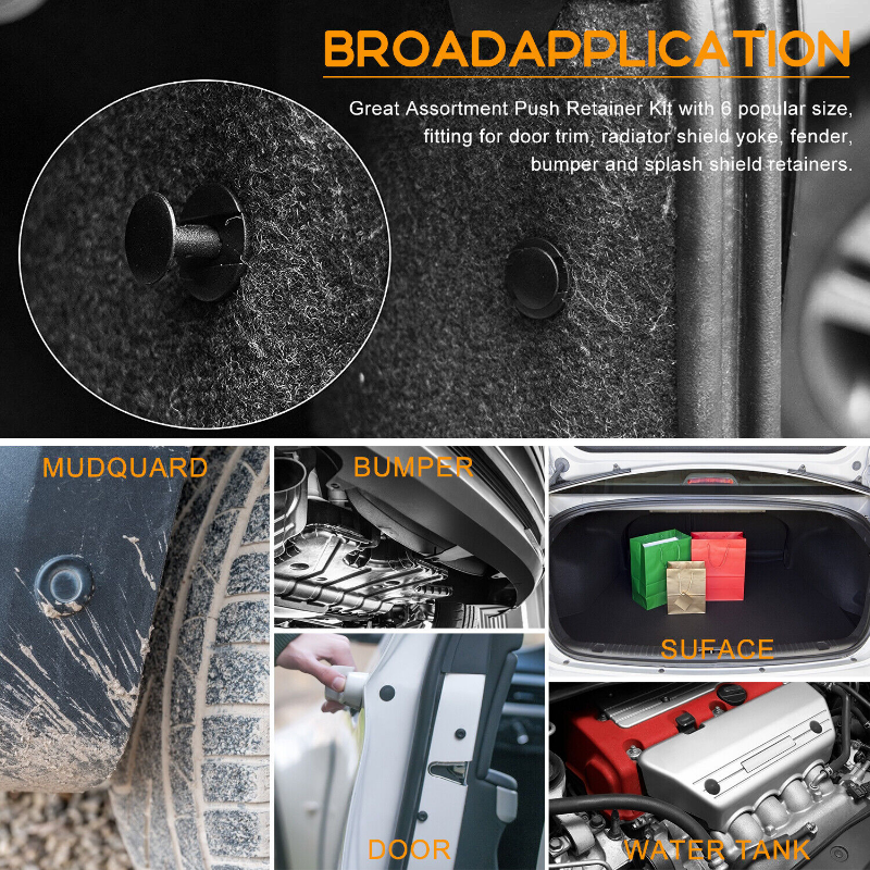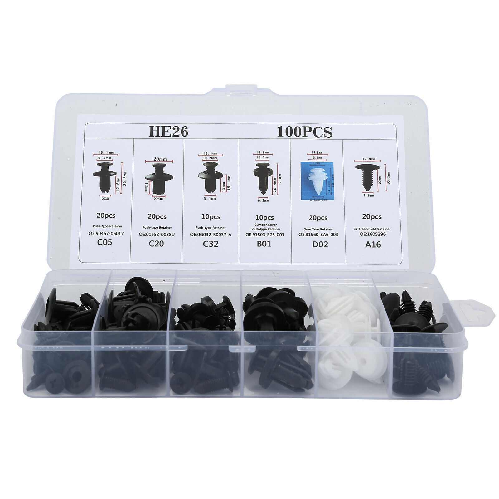 Product Overview Description: Features: Various fasteners to meet the needs of different parts of the car. Used widely for car fender, bumper, door or other car surface. High quality plastic material, durable and long service life. Note: All vehicles have a range of different clips used on them. Different models have different sizes and there are no universal clips. Please check as much as possible before buying. Package including 100pcs Clips + 1 Plastic Box Clip of C05 Screw Type Clip Retainer Rivet Condition: Brand New Material: Black Nylon Size Approx: Head Diameter: 15mm Stem Length: 12mm Fits Into 6mm Hole For GM Replace 20426301 For Mazda Replace 9926-50-625 For Toyota Replace 90467-06017 For Toyota Replace 90467-06017-20 For Toyota Replace 90467-06017-41 For Auveco A14260 Clip of C20 Fender Liner Clip Splash Shield Blind Rivet Fits For Mazda Replace FB01-56-964 Fits For Honda Replace 90675-SB3-003 Fits For Nissan Replace 63876-95596 Fits For B16 B18 B18C B20 H22A EK9 EG6 Fits For Accord Civic Prelude CR-V Del Sol CRX Fits For INTEGRA GSR S2000 AP1 MUGEN Fits For TYPE R Si Condition: Brand New Material: Black Nylon Size Approx: Head Diameter: 20.6mm (0.81") Stem Length: 9.5mm (0.37") Fits Into 8mm (0.32") Hole For Auveco A16000 Clip of C32 Push-Type Retainer Black Nylon Head Diameter: 20mm Stem Length: 13mm Fits Into 8mm Hole Fits For Mazda 6 2002-2006 Fits For Mazda 323 1998-2003 Fits For Ford Aspire Fits For Mazda Replace B092-51-833 Fits For Ford Replace MB-455-56143 Fits For Kia Replace MB455-56-143 Fits For Nissan Replace 09409-09302 Fits For Hyundai Replace 86590-28000 For Auveco A17632 Clip of B01 Front & Rear Bumper Retainer Push Type Clip Condition: Brand New Material: Black Nylon Head Diameter: 20mm Stem Length: 18mm Fits Hole Size: 10mm For Honda Replace 91503-SZ5-003 (1996-On) For Acura Replace 91503-SZ5-003 For Auveco A20564 For PAS9282, PAS938 Clip of D02 Interior Trim Board Retainer Clip White Nylon Top Head Diameter: 13mm Middle Head Diameter: 16mm Bottom Head Diameter: 18mm Stem Length: 15mm Stem Diameter: 8.5mm x 8.5mm Overall Length: 20mm Fits For GM Replaces 94858299 Fits For Geo Prizm 1998-On Fits For Toyota Replaces 90467-10161 Fits For Sienna, Solara & Tercel 1990-On Fits For Previa 2007-On, Corolla 2003-On Fits For Lexus LS460, LS460L 1990-On For Auveco A18876 Clip of A16 Radiator Yoke, Fender & Bumper Shield Retainer Christmas Tree Type Clip Black Nylon Head Diameter: 17.8mm Stem Length: 20mm Stem Diameter: 7.6mm For GM Replaces 1595864, 1605396 For Ford Replaces 388577S For Ford Replaces W705589-S300 For Auveco A11146, A15414 Shipping All items will be checked before packing. All items are new and of high quality. 1. Can you tell me when my order will be shipped? Actually we will ship the item within 1 business day after receiving orders, excluding weekends and public holidays. But USPS need to take longer time to update tracking info and arrange delivery during the challenging time for now. If your order was not shipped more than 3 business days, please contact us with your order number to get quick support. 2. My item has not arrived, what's taking so long? Sometimes items take longer than expected, especially if it's going far or to rural area. Check with your post office to see if your item has been held up. Sometimes USPS will not update a tracking number until it has arrived at its destination. If your item still has not arrived after a few days, let us know so we can double check for you and help solve it asap. Payment 1. Instant PayPal payment is the preferred method of payment. We also accept payment via PayPal, DebitCard, Visa, MasterCard, Discover. 2. Items will be shipped to your eBay address. Please make sure it is correct. 3. If you want to ship to other address, please change your PayPal shipping address before you make payment. 4. Payment must be received 4 days after auction ended. Returns 1. Customer satisfaction is our top goal. We believe our items are so outstanding. All products are quality checked. They are new and in good condition when shipped to our customers. We are convinced you will be happy with your Purchase. 2. We offer free return & money back guarantee. If you are not satisfied with your purchase for any reasons, you can return the item for refund or replacement/exchange. All returns must include the original packaging. 3. Please contact us first if you have any problems/questions/concerns. We will be happy to resolve any issues you may have in a cordial and friendly manner. Any items damaged because of incorrect installation will not be refunded. Please contact us for return or troubleshooting help prior to returning any products. 4. We appreciate your Postive Feedback, and will do the same in return. DO NOT leave negative feedback without first communication with us. Please allow max 2 business days for us to response. About Feedback 1. When you satisfied with our product and services please leave us positive feedback. 2. If you have ANY questions with shipping, product or service, please Contact Us first before leaving feedback/write a review or filing a return case. We will solve the problem! If you have ANY questions with shipping, product or service, please Contact Us first before leaving feedback/write a review or filing a return case. We will solve the problem! We always put our customers first and your satisfaction is guaranteed.