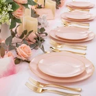 Premium Quality: Expertly made using heavyweight plastic construction for long-lasting strength, these pink plastic plates are resistant to breaking, bending and snapping. BPA-Free and non-toxic, this pink disposable plates are 100% food grade plastic ensures a safe eating experience for you and your guests. Elegant Appearance: 7.5inch gold rim plastic plates can hold more food and the gold rim make pink and gold plates look more refined and luxurious. For Every Occasion: This pink gold plates that is suitable for a variety of social events and occasions, such as for weddings, birthday parties, holidays, picnics, Suitable for banquets and all occasions. Good Value: Want more time to celebrate with your family? You can get rid of the pink plated plates or you can wash the pink dessert plates by hand and reuse them. Premium Set of Dinnerware: Our gold trim plastic plates are excellent options that you will get everything you need in this kit - plates (100 7.5inch dessert plates), which are perfect for events that you need to feel fancy or special.