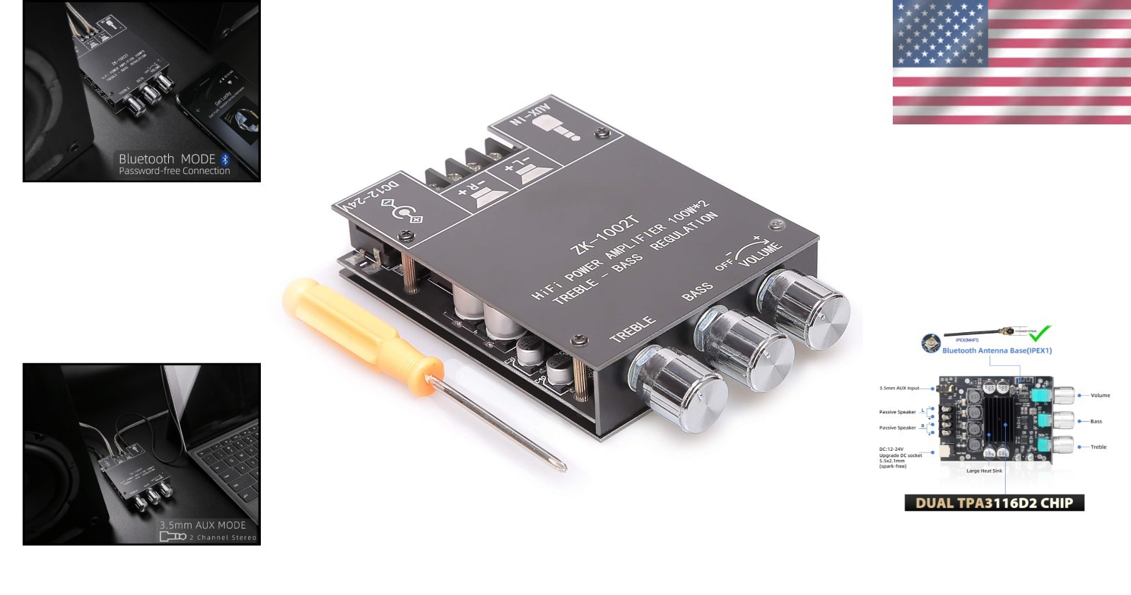 100W+100W Bluetooth Amplifier Board with Treble & Bass Control for DIY Speakers ‹ › ‹ › ‹ › ‹ › ‹ › ‹ › ‹ › ‹ › ‹ › ‹ › 100W + 100W Bluetooth Amplifier Board Elevate your audio experience with our cutting-edge 100W + 100W Amplifier Board, designed for DIY enthusiasts looking to create wireless speakers that deliver rich, immersive sound. Product Features: Treble & Bass Control: Tailor your soundscape! Adjust high and low frequencies to create a theater-like atmosphere for movies or music. BT and AUX Functionality: Enjoy seamless connectivity with Bluetooth 5.0, offering a transmission distance of up to 49 feet in open spaces. Additionally, connect via AUX with a 3.5mm headphone plug if your device lacks Bluetooth. Robust Safety Features: Equipped with overheat protection, circuit protection, and mechanisms to guard against over-voltage and under-voltage scenarios, ensuring safe and reliable operation. Outstanding After-sales Service: Customer satisfaction is our priority! Our dedicated service team is available 24/7 for any inquiries or quality concerns, ensuring you receive the support you deserve. Power Adapter Included: Comes with a 19V 4.74A power adapter for easy setup and operation. Specifications: Input Mode: AUX/Bluetooth Max Power Output Per Channel: 100W + 100W Recommended Speaker Parameters: 20-200W (4-8Ω) Working Voltage: DC 12-24V Heat Sink Dimensions: 36 * 25 * 10 mm Why Choose Our Amplifier Board? Transform your audio setup with a seamless blend of power and precision. Whether for movie nights or music sessions, the adjustable treble and bass controls let you mold sound to perfection. Its robust safety features add peace of mind while enjoying your favorite tunes. With convenient Bluetooth connectivity and the option for wired input, this amplifier board epitomizes versatility and quality. Ready to amplify your sound experience? Order your 100W + 100W Bluetooth Amplifier Board today and embark on a journey of audio excellence! Shipping Free & Fast Shipping - We offer free shipping to most of the USA with a normal delivery time of 3-7 days. However, due to the current situation, additional delivery time (up to 3 weeks) may be required for some items. Alternative Carriers - We may use alternative carriers (e.g. USPS, FedEx, UPS, etc.) to ensure your package arrives safely and on time. Due to the use of multiple carriers, we are unable to provide a tracking number automatically. Handling Time - Orders are processed and shipped within 1-2 business days of receiving cleared payment. Shipping Restrictions - Shipping to Alaska, Hawaii, Puerto Rico, Guam, and other US territories may incur shipping charges or delivery restrictions. Please contact us before ordering, or your order can be refunded/cancelled. State Restrictions - There may be restrictions based on your state of purchase. For example, certain items may not be shipped to California due to state regulations. Contact for Tracking Updates - If you require tracking updates or have any concerns about the delivery of your order, please feel free to contact us, and we will be happy to assist you. Return 30-Day Hassle-Free Returns - We want you to be completely satisfied with your purchase. If you are not, you can return the item within 30 days of receiving it for a full refund or exchange. Easy Return Process - To start a return, simply contact us and we will provide you with a prepaid return shipping label and detailed instructions. Restocking Fee - There are no restocking fees for returns. However, the buyer is responsible for return shipping costs if the return is not due to a seller's error. Refund Processing Time - Refunds will be processed within 5 business days of receiving the returned item in its condition. Payment We accept all major credit cards, PayPal, and Apple Pay for your convenience. Your payment information is secure and encrypted to ensure a safe and seamless transaction. Please complete your payment within 3 days of purchase to avoid any delays in shipping. Feedback Your feedback is extremely important to us. We strive to provide the best products and customer service possible. If you are satisfied with your purchase, please take a moment to leave us a positive review. If you have any concerns or issues with your order, please contact us before leaving negative feedback. We are committed to resolving any problems and ensuring your satisfaction. Contact Us If you have any questions or concerns, please feel free to out to our customer support team. You can contact us through the eBay messaging system. We are available Monday to Friday, 9:00 am to 5:00 pm EST, and we will do our best to respond to your inquiry within 24 hours. Buy it now and enjoy a pleasant shopping experience! Unit Quantity: 100 Compatible Brand: Amplifier Board Features: Amplifier,Bluetooth,AUX,Treble Control,Bass Control,Overheat Protection,Circuit Protection,Over-voltage Protection,Under-voltage Protection,Heat Dissipation,After-sales Service,Bluetooth 5.0,AUX Input Compatible Model: ZK-1002T Type: DIY Amplifier Kit Color: Black Unit Type: Unit Amplifier Class: AB